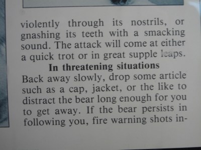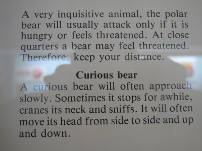 In all my travels this was one of the more curious signs I came across. It is posted in the airport in Rankin Inlet. I’m not sure I would think of dropping a piece of clothing to distract him as I might be distracted!