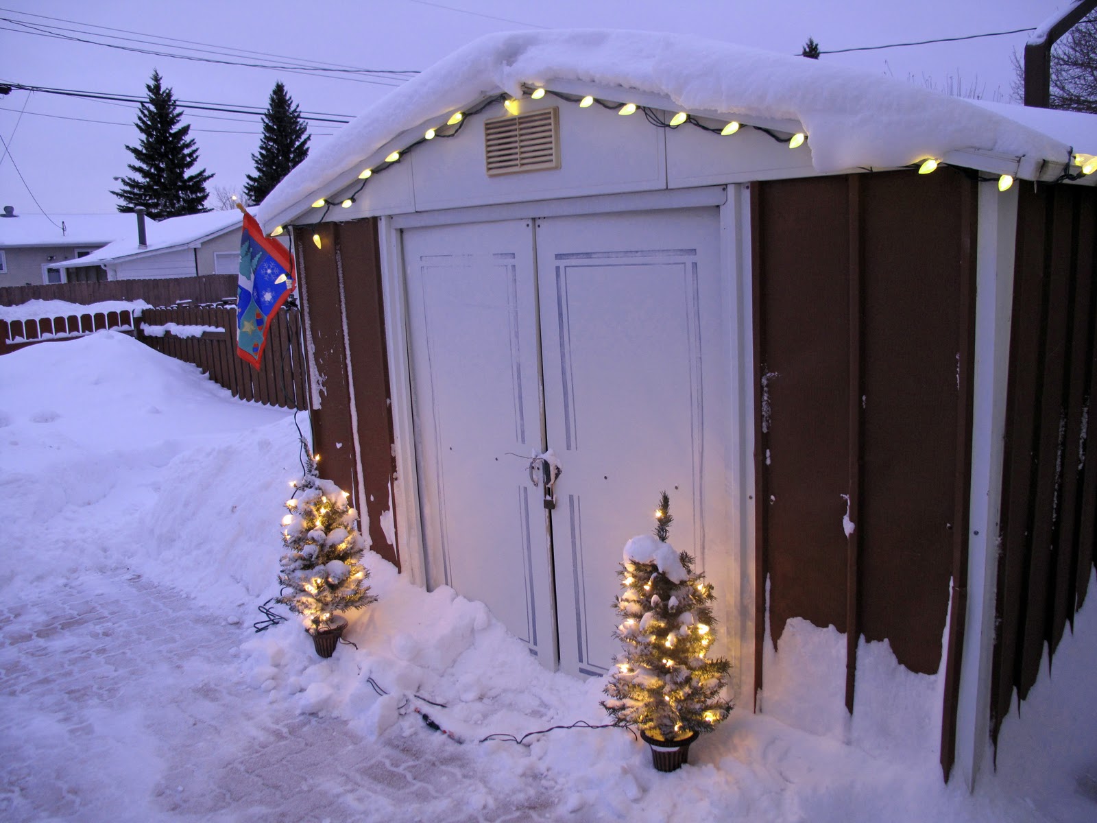 For years we’ve had a flag celebrating the different seasons flying from our home. In Edmonton the best place to locate it seemed to be on the short fence between us and our neighbours. We’ve added some small lights and a couple of “outdoor” trees I think gives us some sense of Christmas celebration!