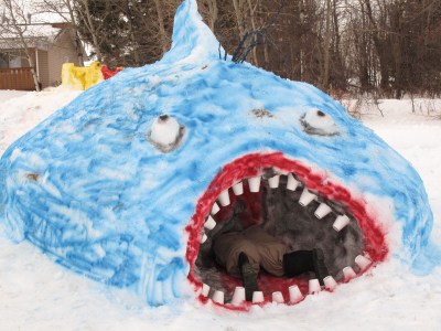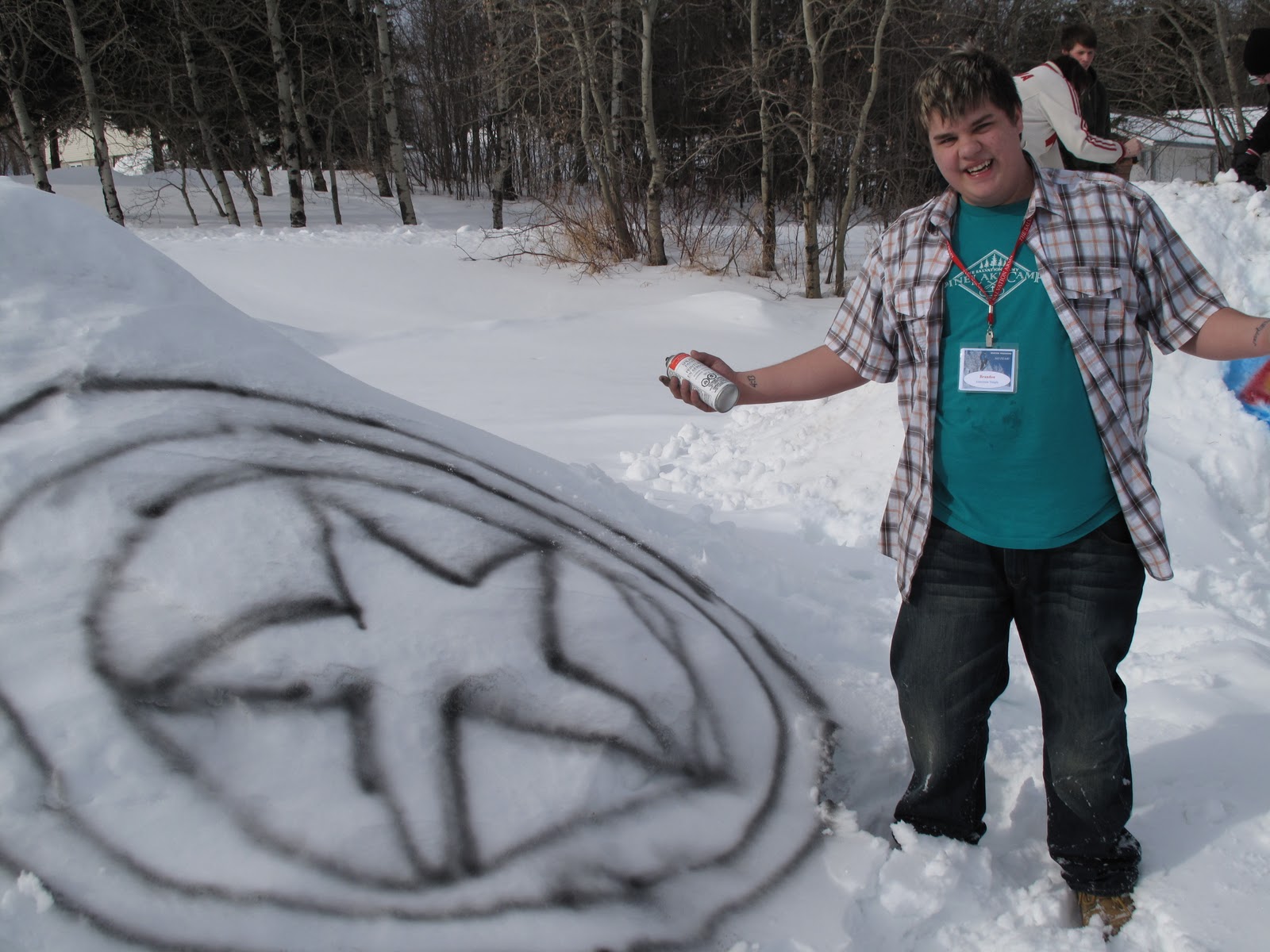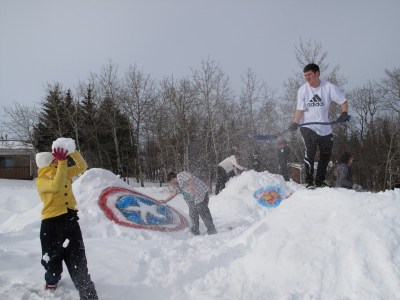 Pine Lake Camp hosted the annual Winter Weekend for teens and young adults. One of the great features of today was the snow sculptures. Four mounds of snow, a group of teens, some spray paint and some tools….and off they went. Two hours later we had Jonah and the whale, the Serpent who tempted Eve, and Captain America!