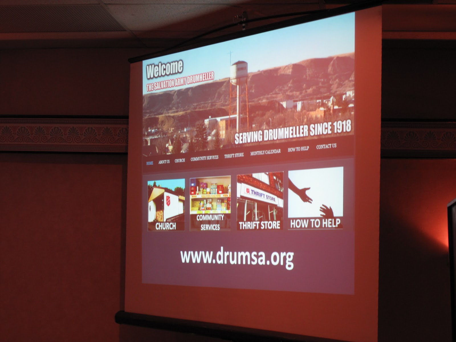 Last evening we were in Drumheller for their Volunteer Appreciation Dinner. Well done Matt and Rachel ! A good turn out and a fine representation of what TSA does in this small town. Located in a very deep and long coulee. Coming along the highway you are rolling along the very flat prairie when you suddenly descend down into the valley. It is a very different landscape – an area known as the Badlands and noted for the significant number of paleontology finds. The area is especially noted for the Royal Tyrell Museum. It was a good evening and a reminder of the early days of our officership when we worked in a similarly small town community.
