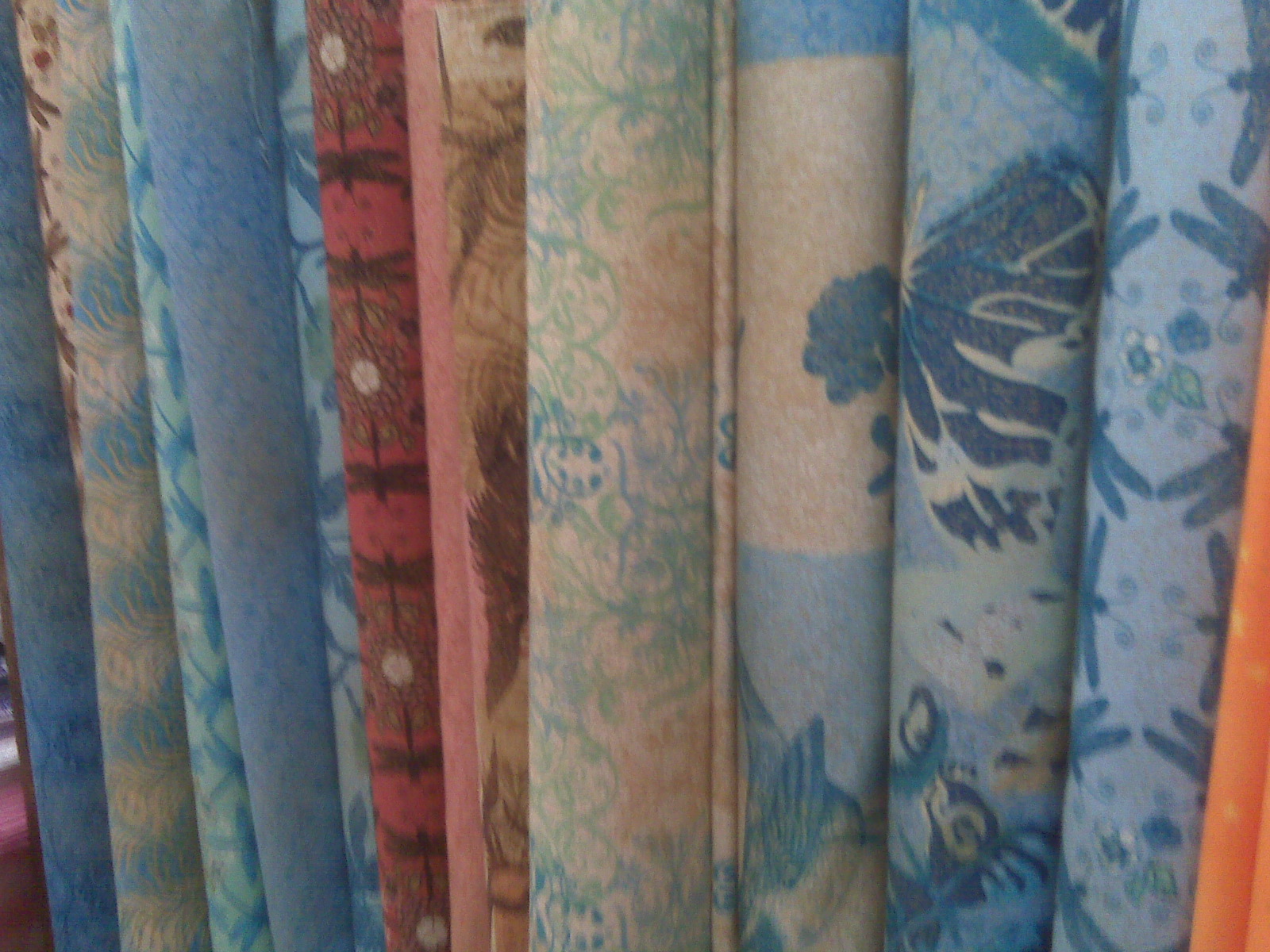 Any serious quilter is usually working on more than one project at a time. In fact, the joy of quilting is knowing that the next project is already begun! This quilt began a while ago – the photo shows the arrangement of fabric at one of my favourite quilt shops in Calgary because of the amazing collection of fabrics. I find it very helpful when a store carries a fabric collection, fabrics that are created to coordinate together or be used as blenders . You can check-out My Sewing Room, they began in a much smaller shop and have really expanded in their newer location. As well as carrying fabrics the walls showcase many projects to inspire yet another project.
