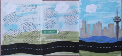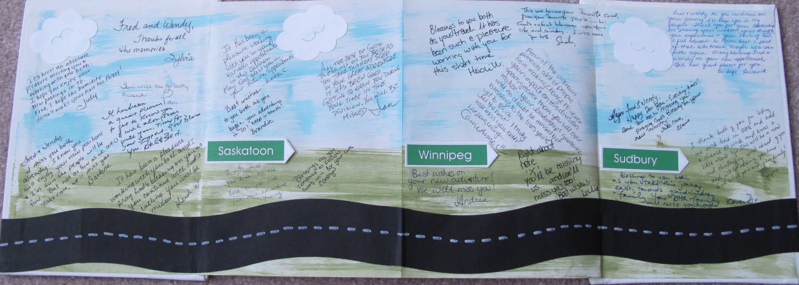 The farewell card from the office staff in Edmonton gave us the most wonderful card to mark the occasion and give us a map and memento that will be treasured. Below is the card – folds out, as you can see, to reveal the road and all the lovely sentiments!