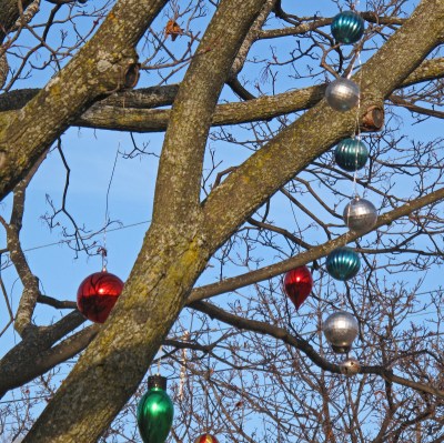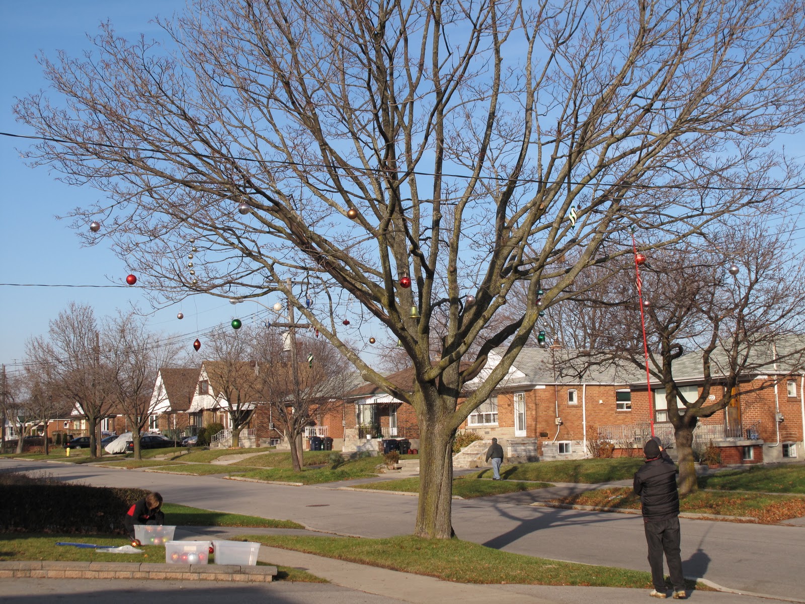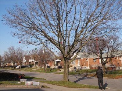 We have great neighbours. They are friendly, real care for their property and look out for us and others. This morning I was out putting up our Christmas lights and decorations. It was 6 degrees today and blue sky. I thought about last year. In 2010 we were in Lethbridge this weekend for the Santa Shuffle, Teddy Bear toss and the Corps’ Christmas program. On the Saturday morning it was minus 28 Celsius. You can see the first of three videos on my You Tube channel. Today our neighbours were out hanging these beautiful balls high up in their tree in front of the house – it looks wonderful. They even hang out over the road. I thought it was very creative.