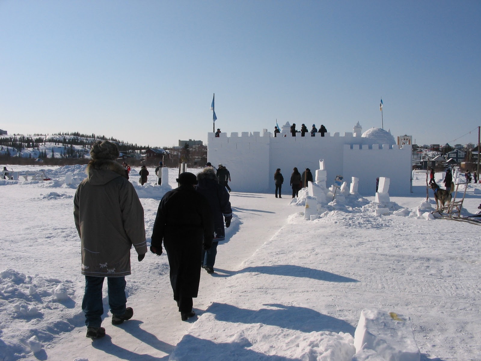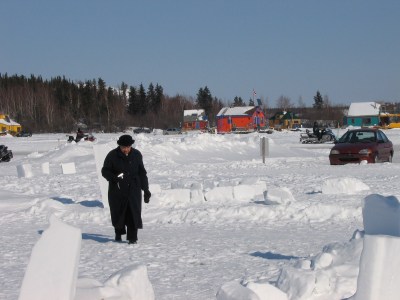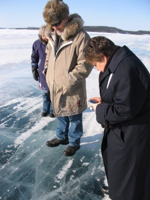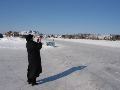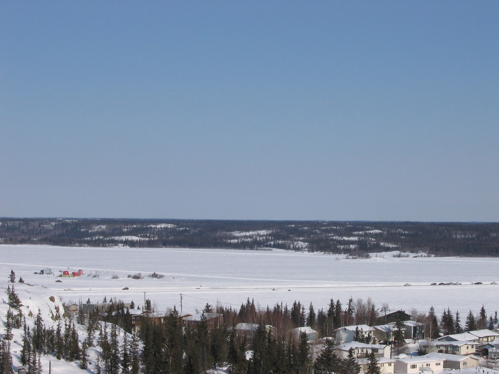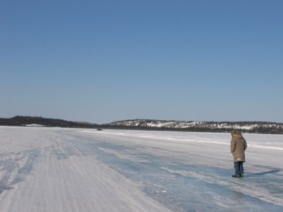 These photos are from March 31, 2008, and a visit to Yellowknife. This part of the world is very pretty – a harsh climate that shines when the sun comes out and the snow gleams! The sky can be very blue here. We had time to go explore the ice road just outside of Yellowknife. The ice is thick – to say the least – of course trucks are on it.