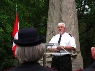 Yesterday afternoon Salvationists gathered at the Mount Pleasant Cemetery to remember those who lost their lives on the Empress of Ireland as well as Officers who have been Promoted to Glory since this same meeting last year. Majors Max and Doreen Sturge led the service with other participants including a solo by Wendy’s Dad.