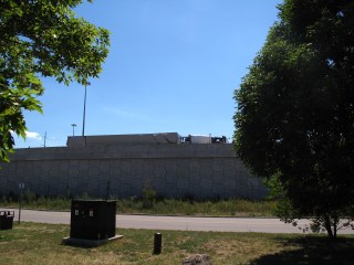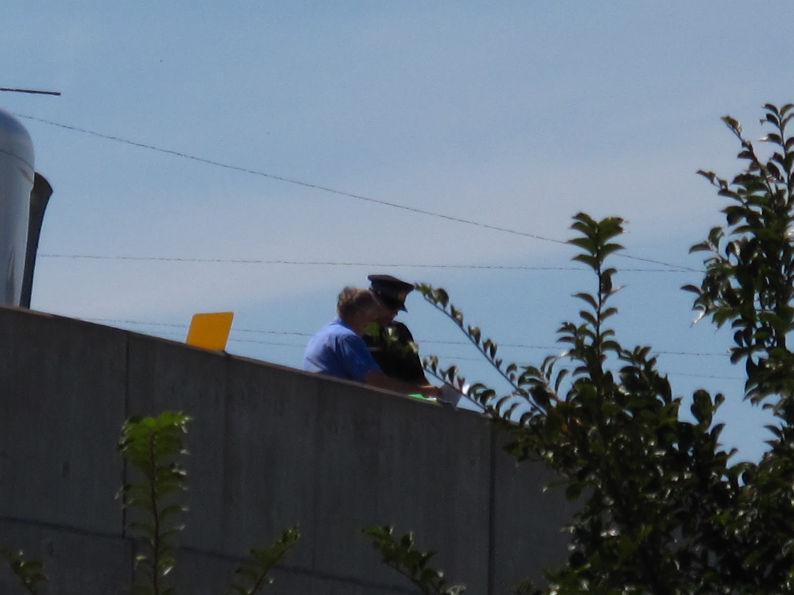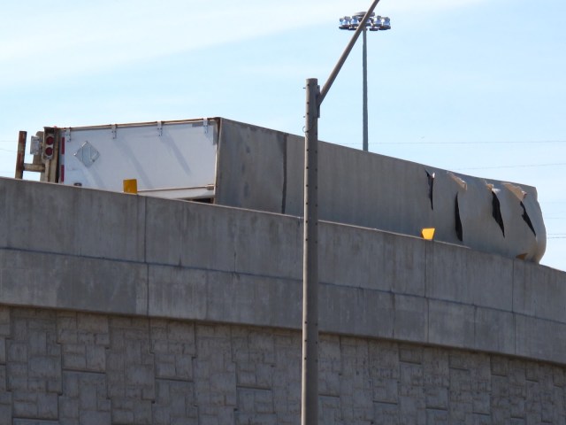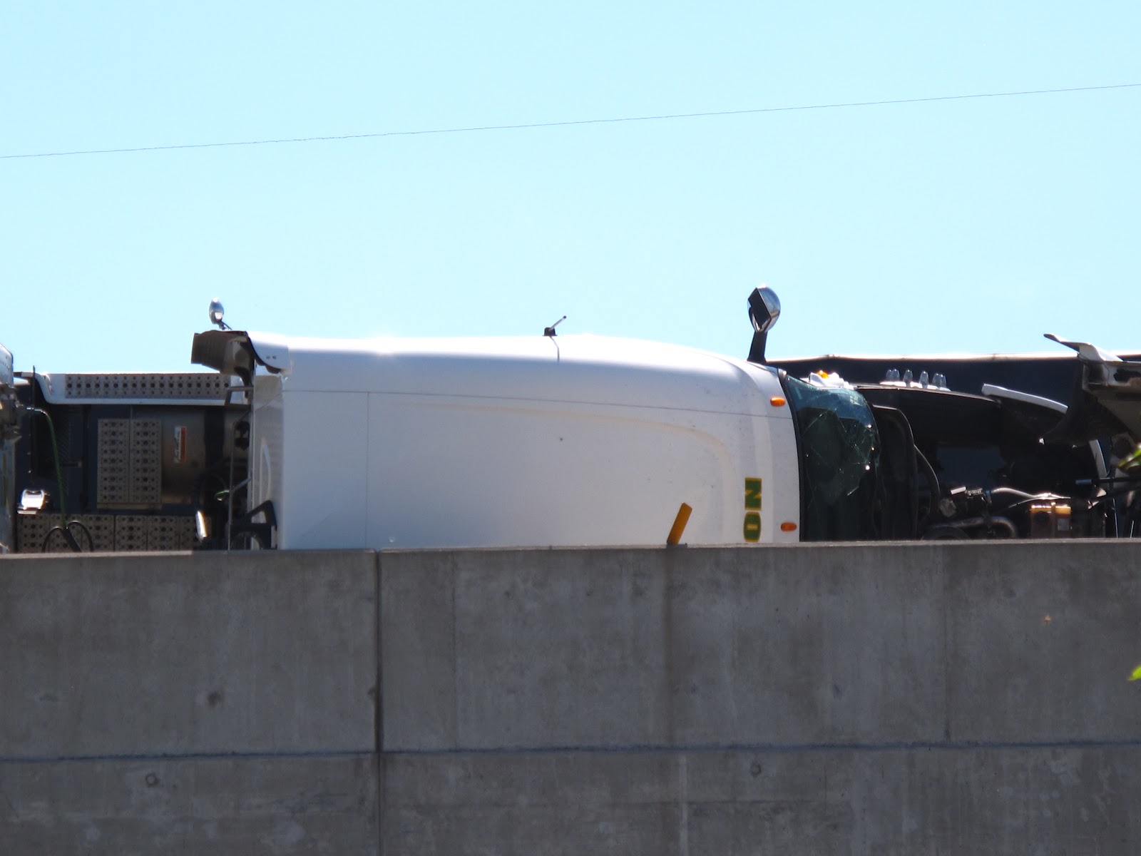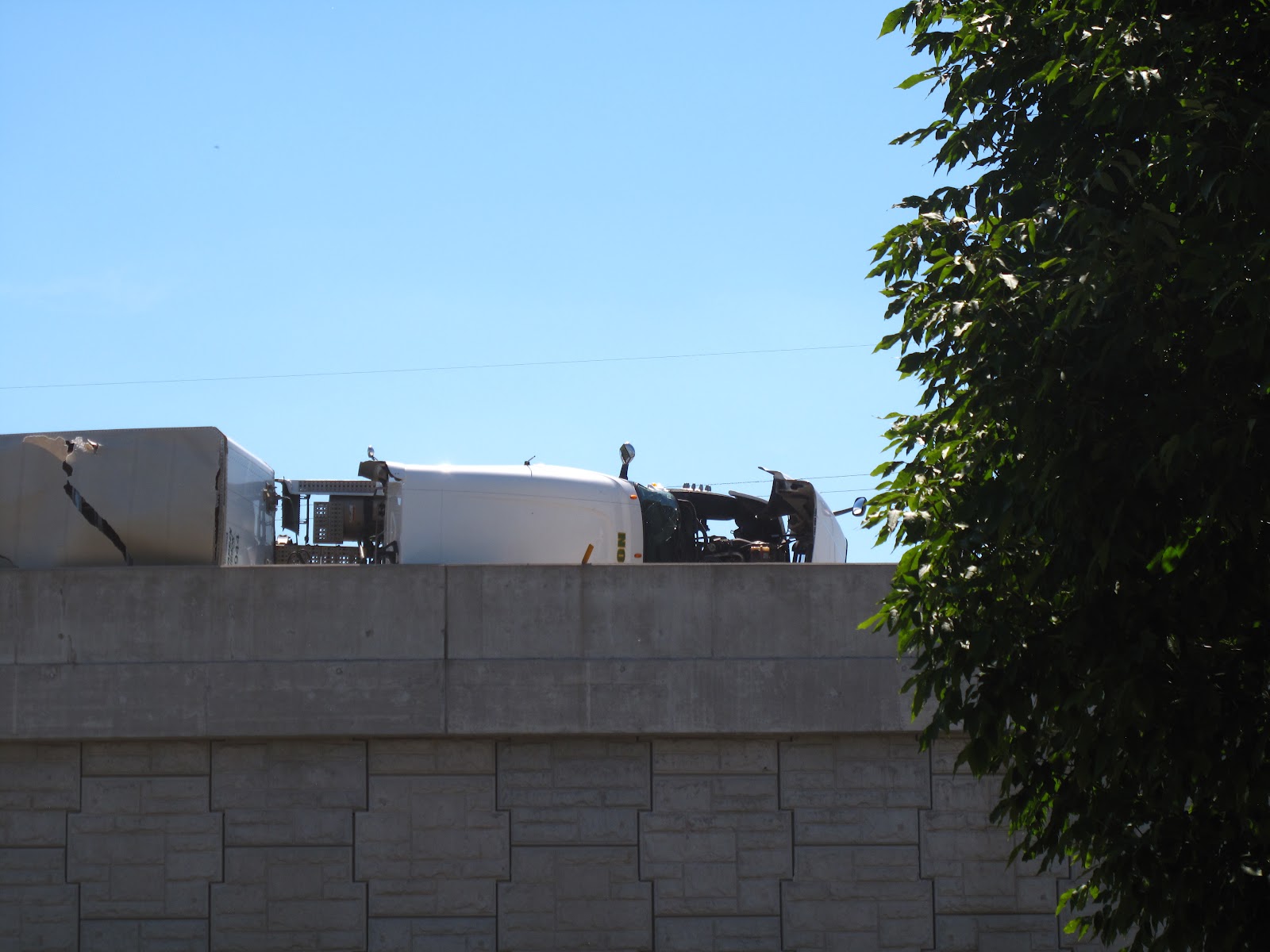 We were in time to see on the ramp (just above us) a white transport truck and trailer tipping over and landing on it’s side…then with more screeching and grinding….it slid into the concrete wall at the edge of the overpass.