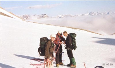 Here’s a photo from June 2001. Philip and I with Tom and Mike climbed Mount Hector…it took us a day and a half. In this photo were just about to step on to the glacier to begin the final leg up to the summit. It was a beautiful day – a day I well remember. First this was the longest trip we had made to date and secondly the idea of the glacier I found to be fascinating. Below was snow, long ago compressed to ice that had been working it’s way down the mountain. Where we stepped on represented many many years of accumulation. But on the end the glacier now melted and ran away to form the streams and rivers below. On the edge today meant something.
