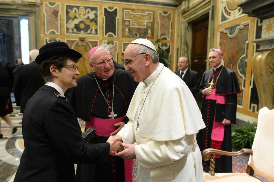 In this picture Pope Francis is greeting General Linda Bond, the international leader of The Salvation Army and a woman. Wouldn’t it be interesting to know what the conversation is about and what the Pontiff thinks of a woman leader!