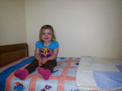 In the midst of a very busy day with many deadlines looming this wonderful picture arrived! Here’s sweet Rachel on her new mattress beaming away like she just got an invitation to ride a pony. You can see she’s on the quilt that Wendy made her after she was born. Each of those squares has an embroidered center – see this blog post for details – and of course it is stitched together with love.