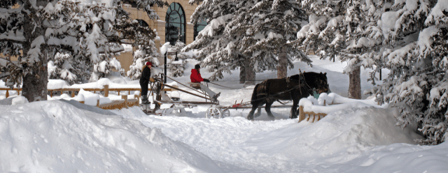 Just outside the hotel at Lake Louise the fresh fallen snow was laid heavy upon the branches and fences around the property. An area on the lake near the hotel was being cleared by a small bobcat and people dressed very warmly walked close together in the minus 25 temperatures. As the sun darted in and out from the fast moving clouds up high in the mountain I could hear the high pitched noise of the bells jingling. I expected, as you might, that the horse drawn sled would have a group of tourists enjoying, as best one can enjoy a sled ride at those temperatures sitting on wooden benches, the afternoon excursion through the beautiful scenery.