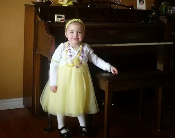| Rachel loves dresses and jewelry it would appear. And Grandma loves buying her special things. Here she is in Grand Falls with Susan’s parents over Easter – thanks Juanita for the photo of her in her dress! She’s as sweet as can be. |