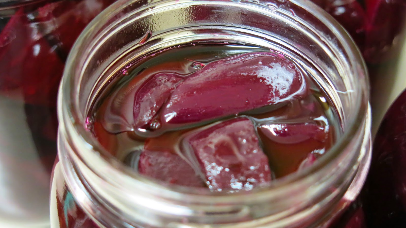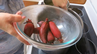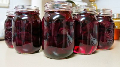 Now we’ve got pickled beets in the fridge. It was a fairly straight forward process – blanch the beets, trim, cut, prepare the vinegar and sugar and put them in the jars together. The challenging part is keeping beet juice contained!