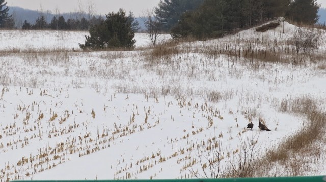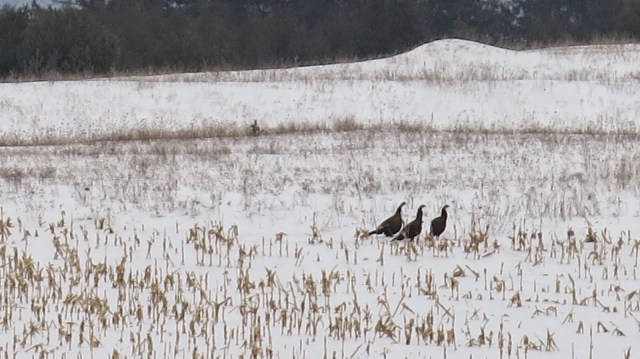 What a surprise to drive along the coutry road and see so many wild turkeys…not butterball….out in the snow pecking for food! Further down the road we came across about 20 ot 30 of them together and as I approached with my camera they took off! I was having some trouble seeing them on the screen of the camera so it’s not the best video I’ve ever posted but it let’s you see them flying up into the trees!