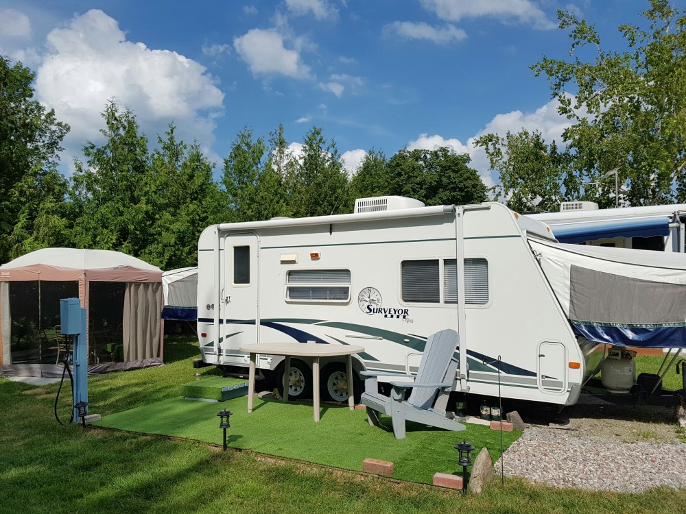 It isn’t too often that my toolbox is out and open, but the trailer does afford opportunity from time to time. This photo shows the trailer as we were leaving today. My new platform for us to exit the trailer is in place, painted and carpeted. Not a big deal for many a handyman, but this Ikeda carpenter was pretty pleased. I also painted our power box and post to blend in to the theme.