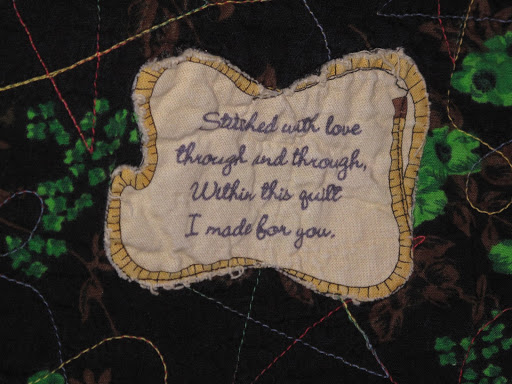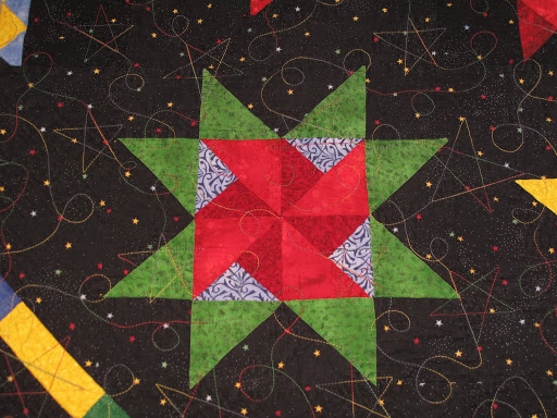 This quilt was one of the block-of-the-month quilts that Wendy made while living in Calgary. I loved the contrast of the bright colours on the black. And when she had it top-stitched she chose a variegated thread with loops and stars that would stand out.