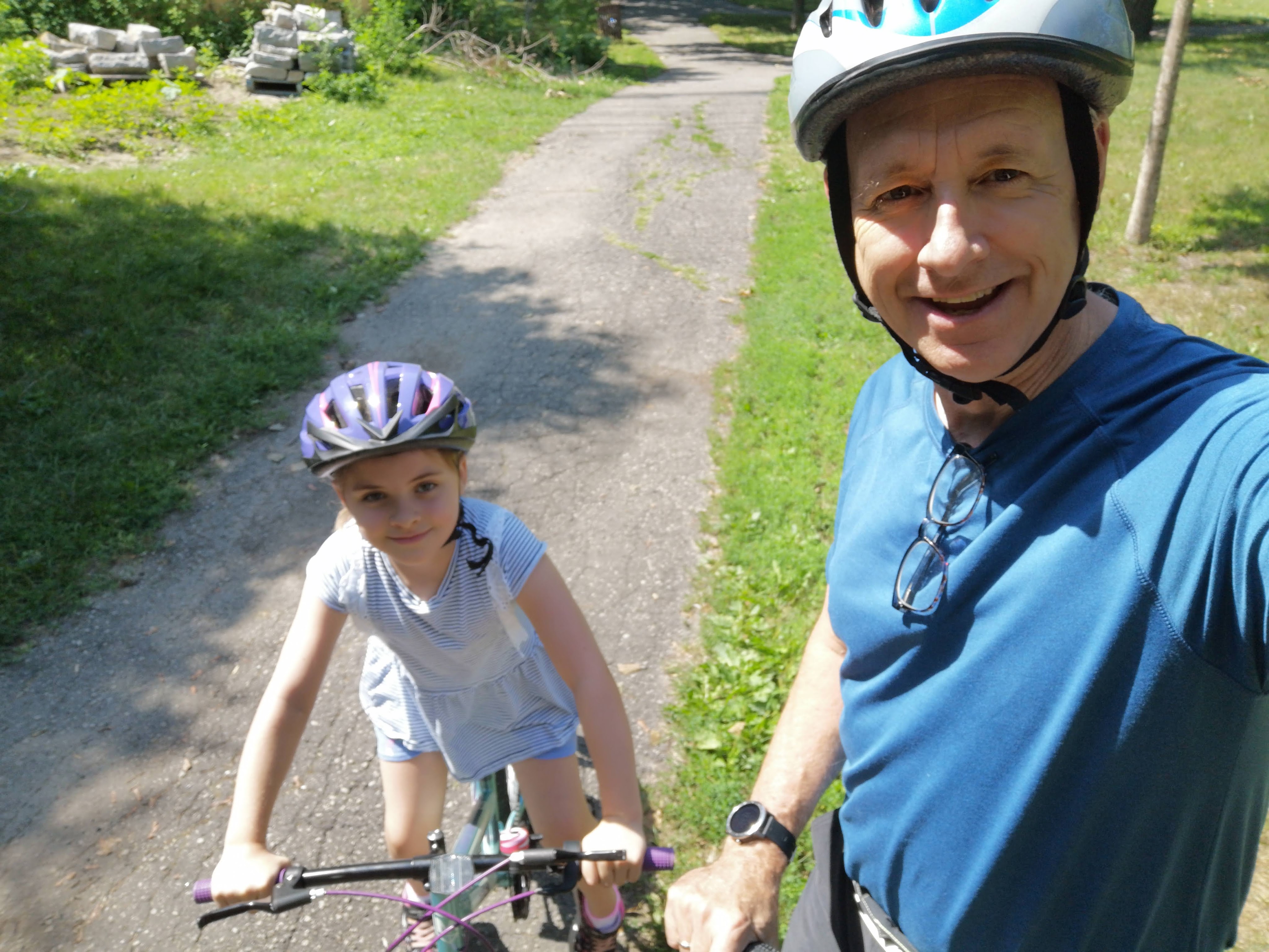We were out riding our bikes on Saturday and Sunday and Rachel now rides like she’s a pro. She was even riding side saddle, two legs on one side of her bike as she coasted down the street. I cautioned her suggesting a fall would really hurt. Her response; “Grandpa, it’s not like I am learning to ride”.