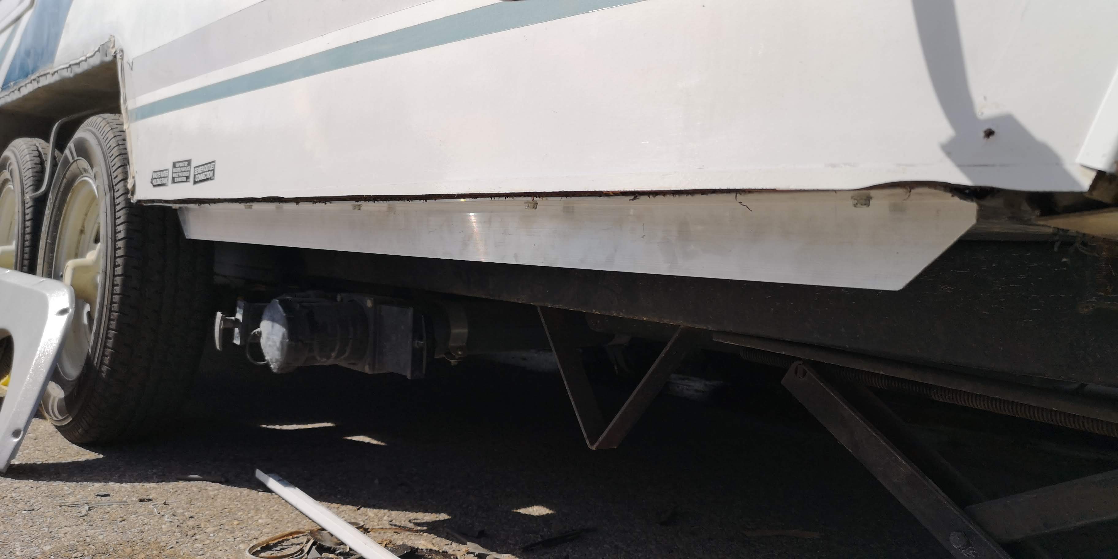 This week Philip began to do some work to help give the trailer some extra life – he fixed the outside water intake that had a leak, used aluminum angle to shore up the under side of the trailer, took up the rotted flooring and replaced it with new underlay and then vinyl on it to give it a new floor. He’s doing some other work too that will improve the trailer.