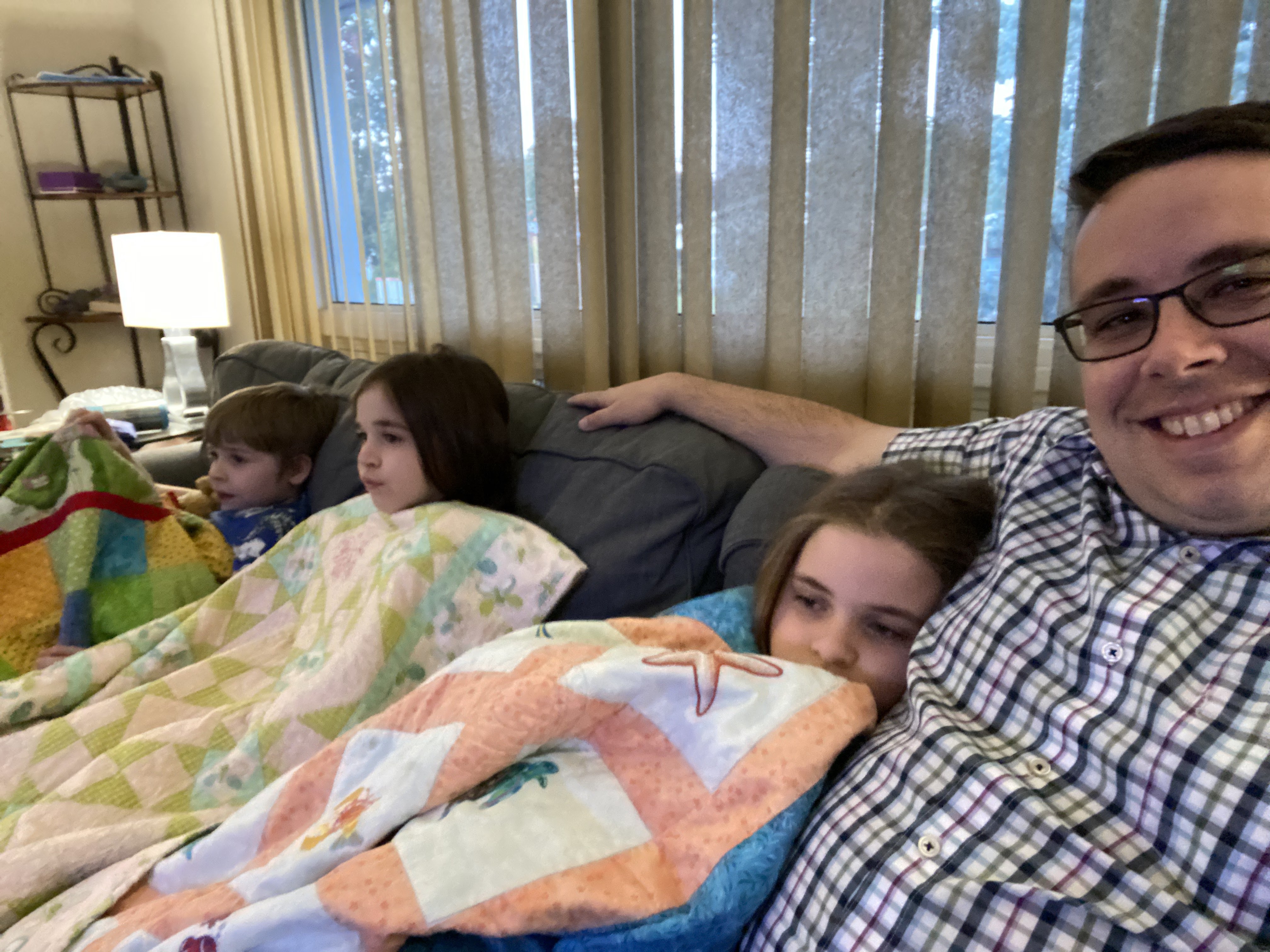 Tonight Jason sent a picture him with the three kids watching a movie (the Friday night tradition) and the kids each had the quilt Wendy made them cuddled up on the couch. What a great picture, what a great memory!