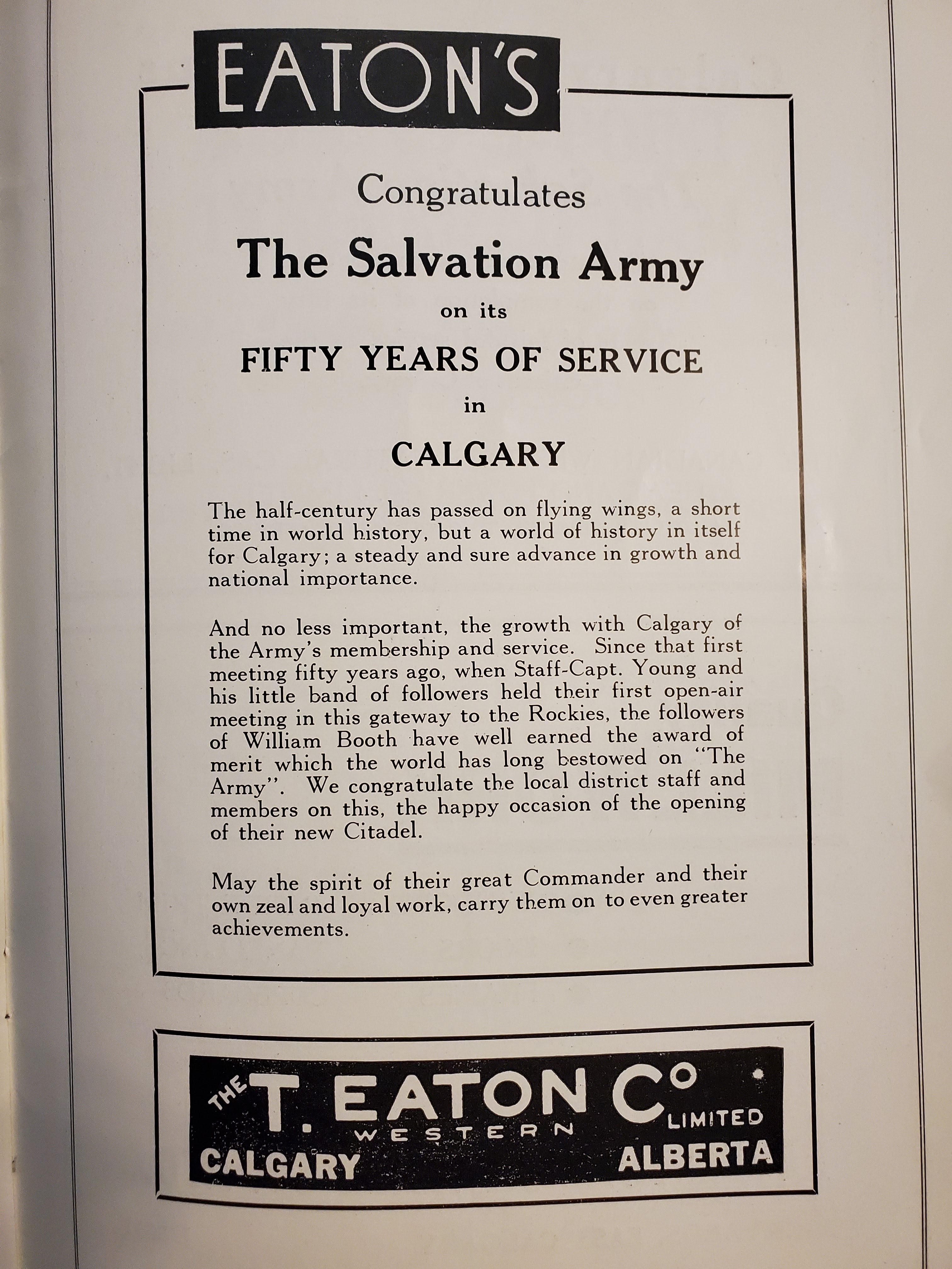 The booklet which celebrated the first fifty years of The Salvation Army in Calgary. Has many interesting pages, but these two struck me – of course in those days Eaton’s would be a very significant economic force. Who would have thought that they would fail and have to close?!