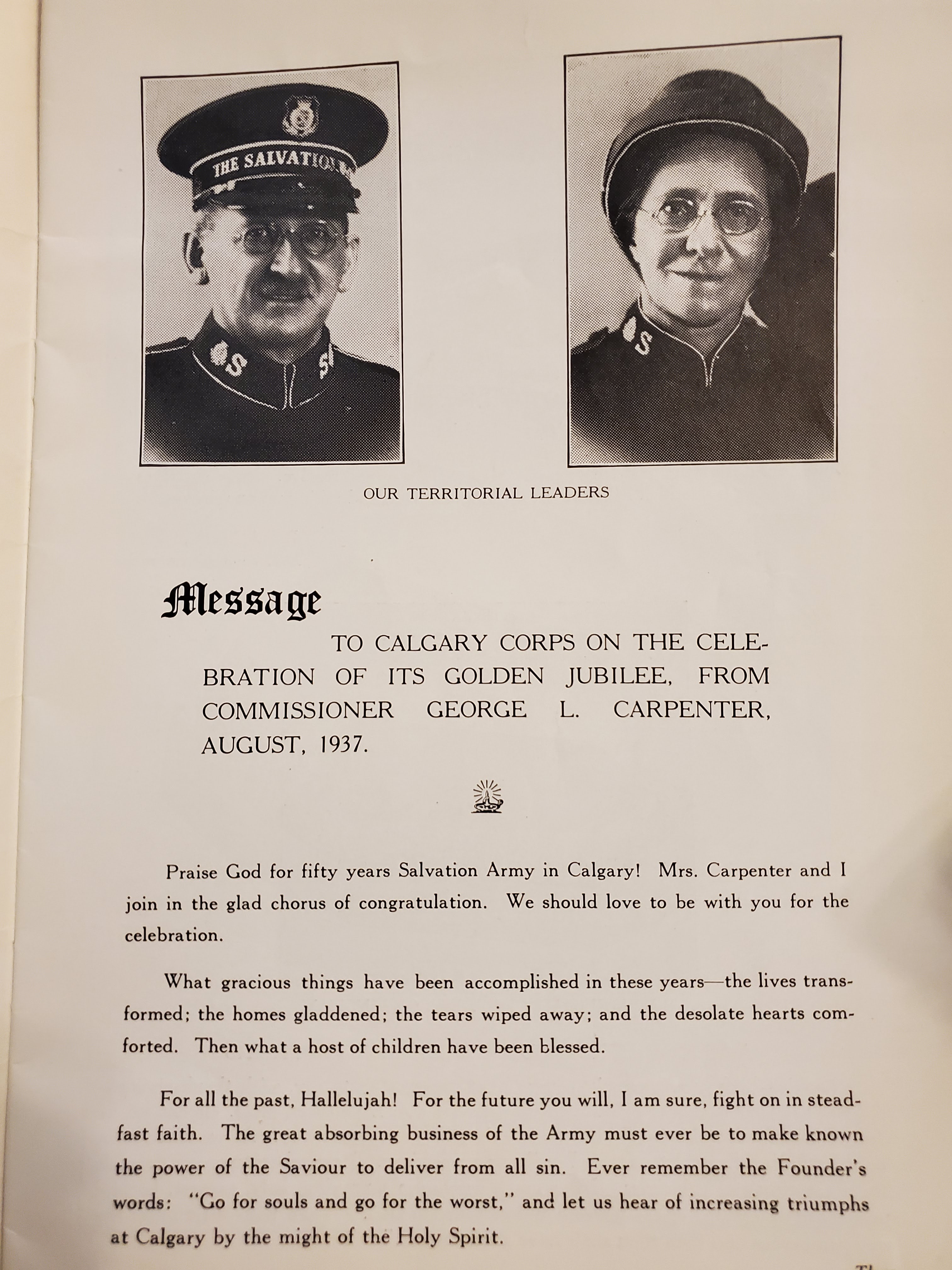 Seven years into the Great Depression, The Salvation Army has been impacted by the removal of General Bramwell Booth from office, the development of the High Council, and in Canada the development of our social work in more institutional ways. In the world, it was 1937 that Henry Ford instituted a 32 hour work week. In a secret meeting with his staff, Adolf Hitler tells them he intends to go to war. There are the beginnings of war already under way with Japan and in Spain… and The Salvation Army is celebrating 50 years in Calgary.