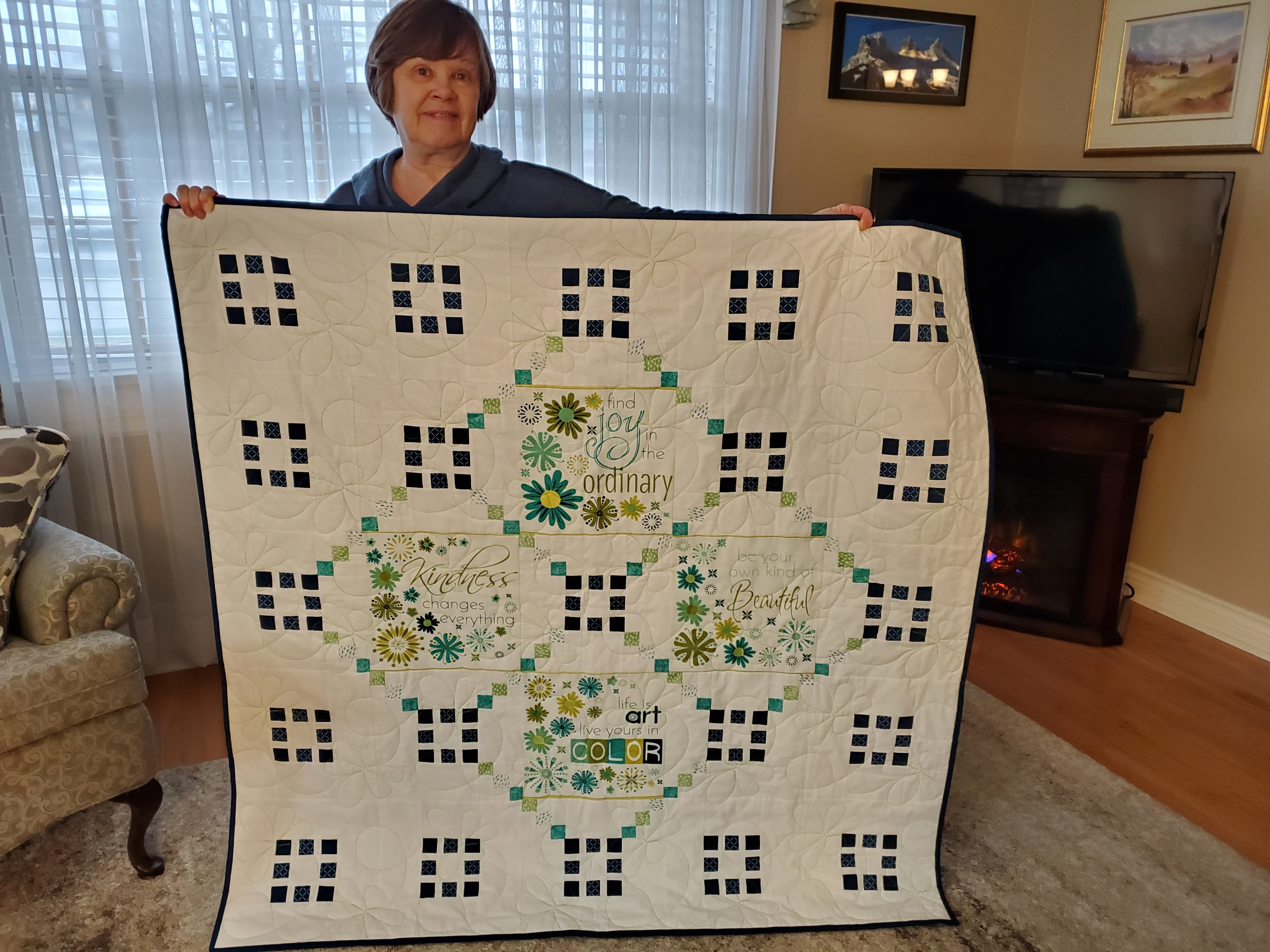 I really love the four sayings on this quilt – find joy in the ordinary (seems fitting for a pandemic), kindness changes everything, life is art live yours in color (US spelling) and be your own kind of beautiful.