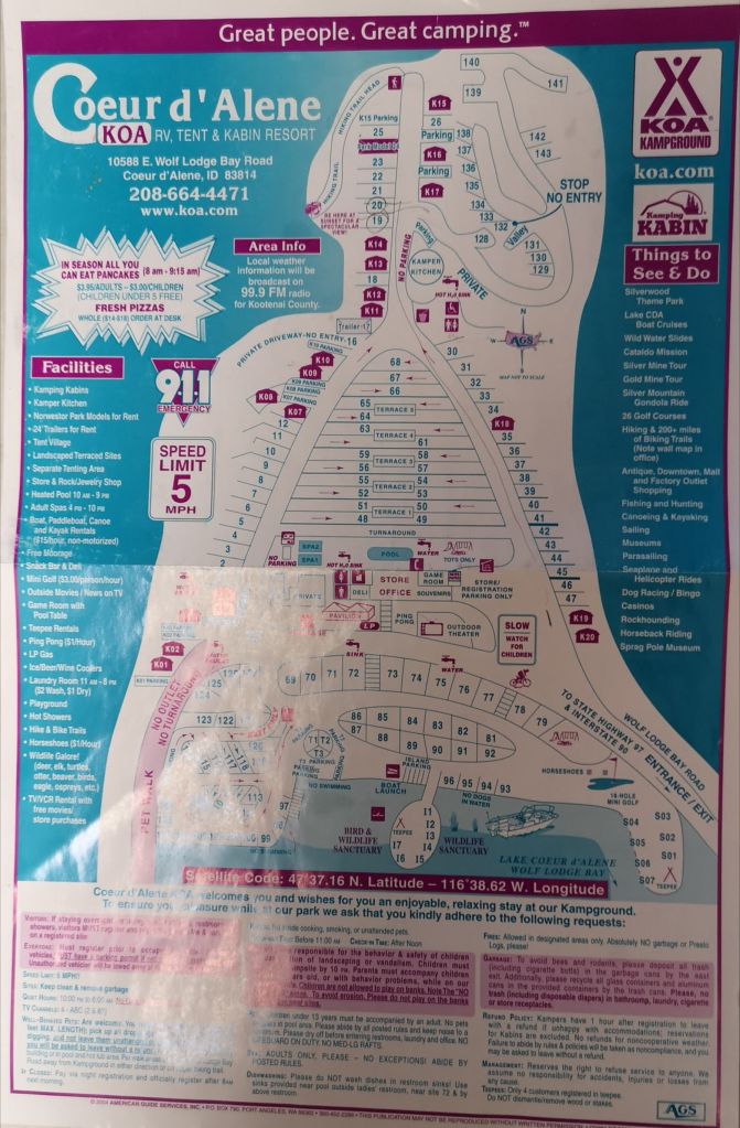 Here was one of our favourite destination park. You can’t tell by looking at the paper but this park is built into quite a steep hill and with a gravel road running up the hill it was always interesting when you heard tires spinning on the gravel when a larger trailer was being put on one of the spots towards the top of the hill. The sites were flat of course, and were tiered so that you would walk out from your trailer and find you were looking down on the roof of the trailer beside you. It did give to you a sense of having more privacy than normal and I suppose in a sense we did. The pool was at the bottom of the hill and the only downside to that was the sewer dump was nearby and occasionally when relaxed at the pool a less than pleasant smell would waft by. Apart from that we have very pleasant memories of this area and I often likened it, in terms of geography to being similar to the Muskokas in Ontario. Couer d’Alene is a lovely small city with good shopping, restaurants and a lovely new Kroc Centre operated by The Salvation Army.