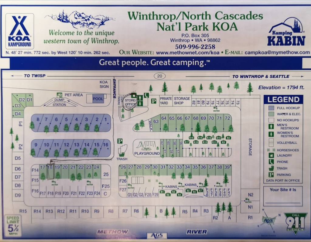 Let’s move south of the border for a moment with Winthrop Washington and the KOA that is in this most unusual setting. This is a dry part of Washington and we came to this one after driving in from the coast. The highway in to the interior and this small town was again absolutely stunning. In fact I would say this was one of the most beautiful drives we have ever done. Winthrop is a fascinating town and has been set up and preserved as it was an old western town with wooden boardwalks. We stayed several days. We had a hot air balloon drop down into the park one day but the real memory of the week we were there was the presence of water bombers nearby as there was a large forest fire over the ridge which meant we could see the smoke and depending upon the direction of wind you could smell the smoke.