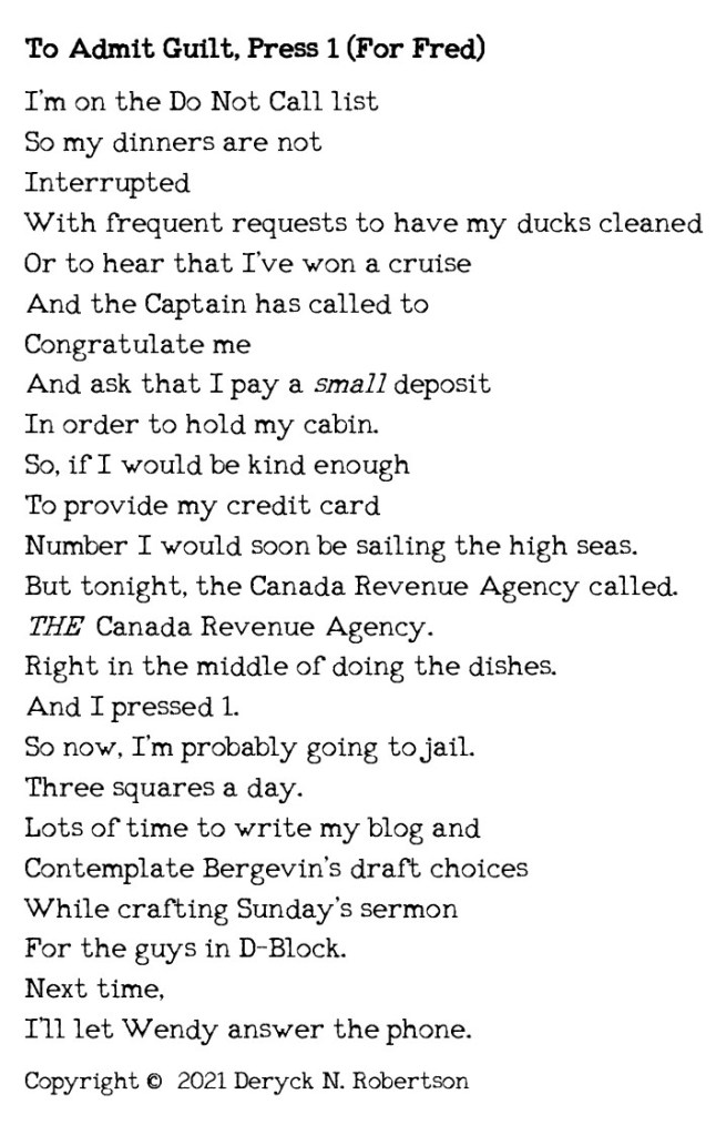 I put a post up on Twitter about the scam calls I was getting from scammers claiming to be from CRA. I said in my tweet that I had pressed one. I got a response from my friend Derek who is a published poet. I wanted to know if I was arrested and sent to jail if he would visit. He suggested he would at least send me a note.