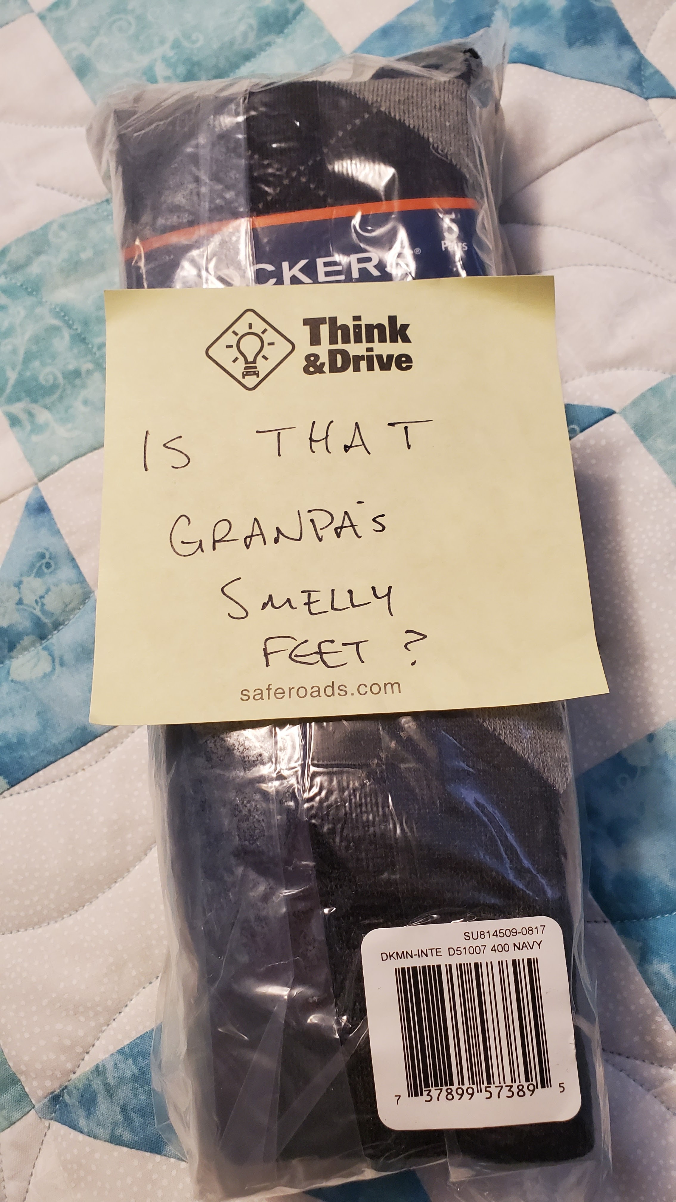 Last summer Phil and Carlyle came to visit. Before he left Philip went through the house and put stickys on all sorts of things. We’ve been finding them ever since. Today, I pulled out my new socks that I bought last year, and yes hadn’t even got them out of the package – I mean where am I going?