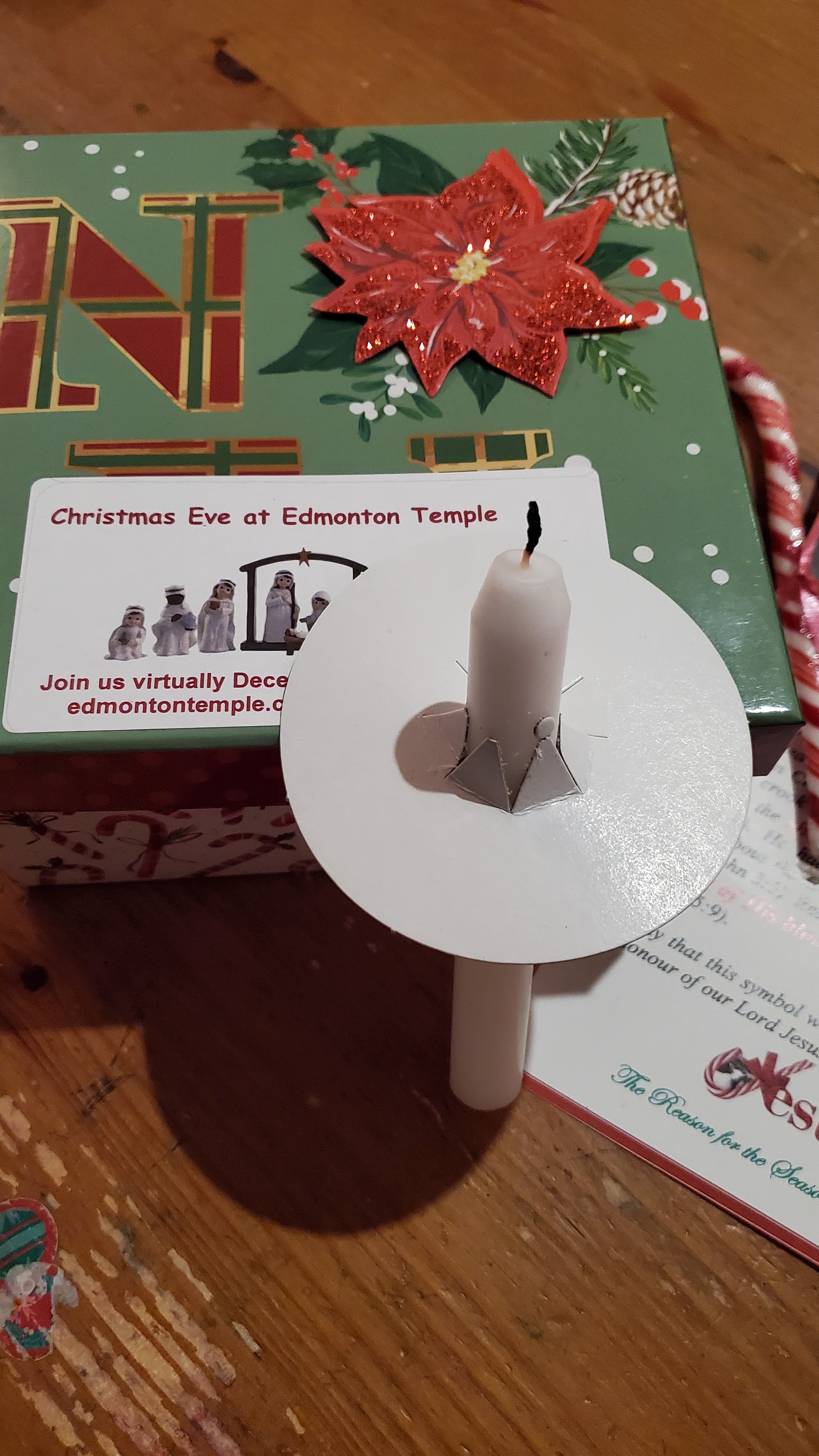 One final thought. We had Christmas Eve together – just missing Philip who was out serving the people of Edmonton bravely, and what a treat that was. After having dinner here (the traditional cabbage rolls and perogies for my birthday) we did our Christmas Eve candlelight service together. Edmonton Temple (see JO) pur together boxes for families to use. It had cookies, hot chocolate mix, candles, and small cards to protect the wax from running down onto your couch.