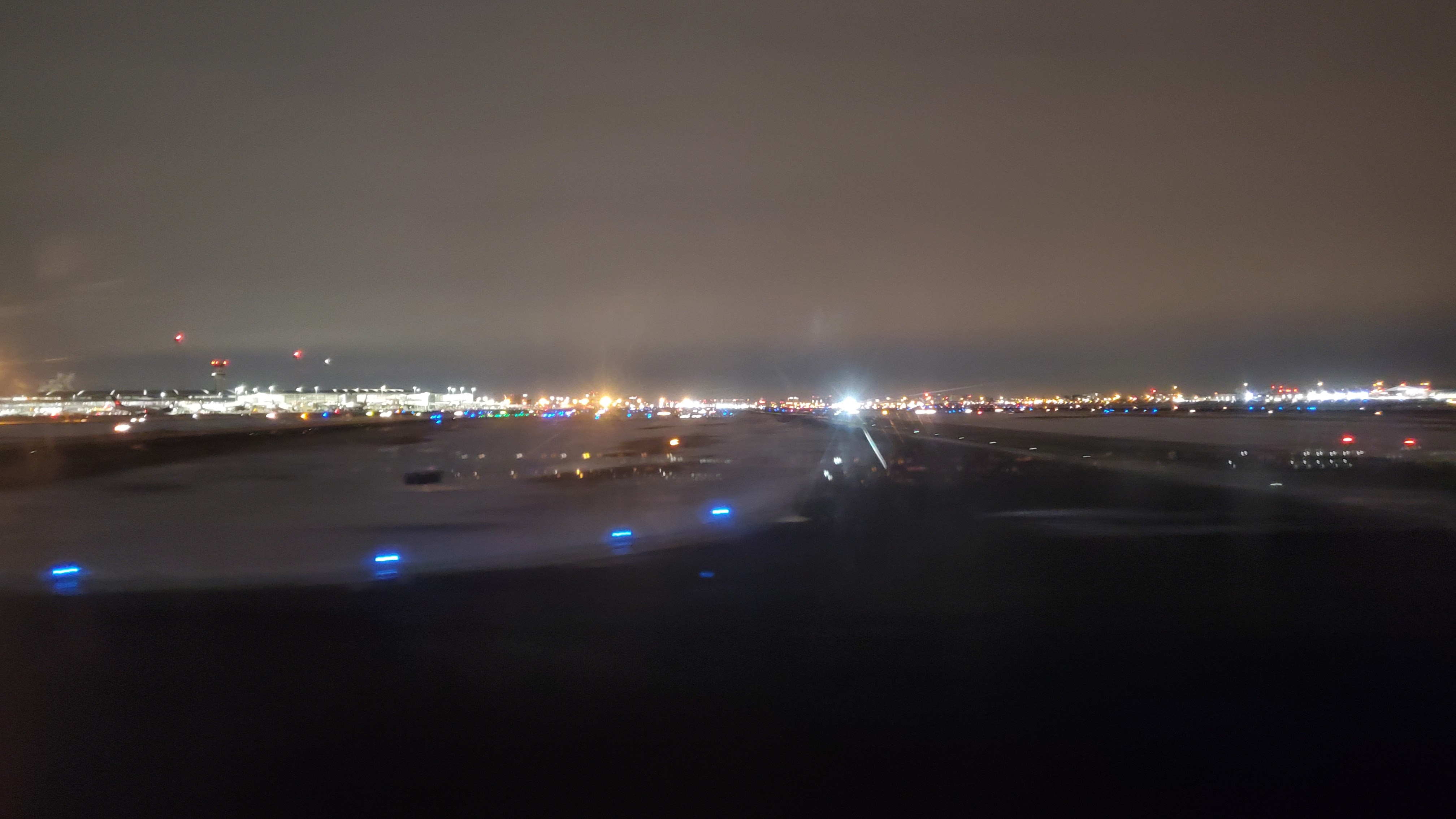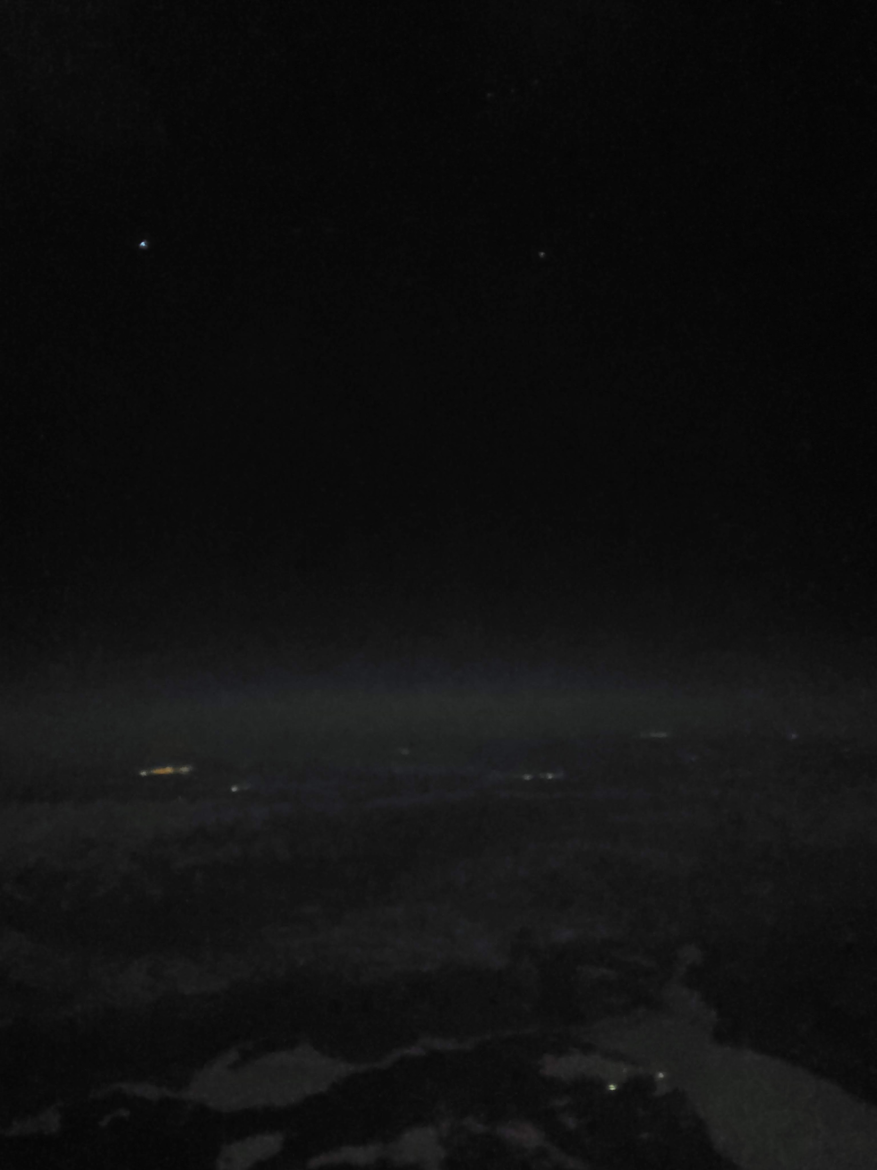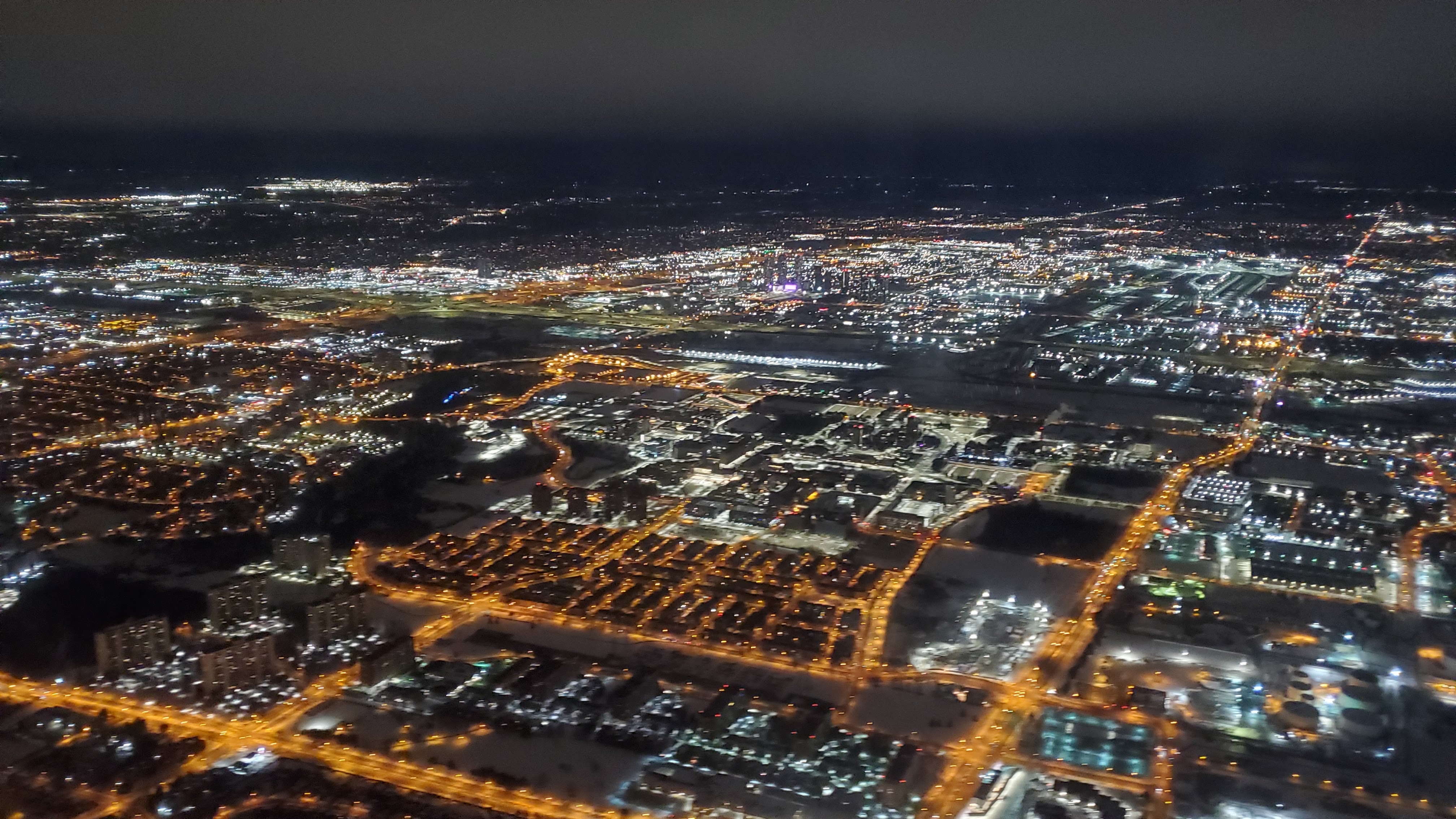 As we passed over Georgian Bay I could see the moon reflecting on the snow and ice below.