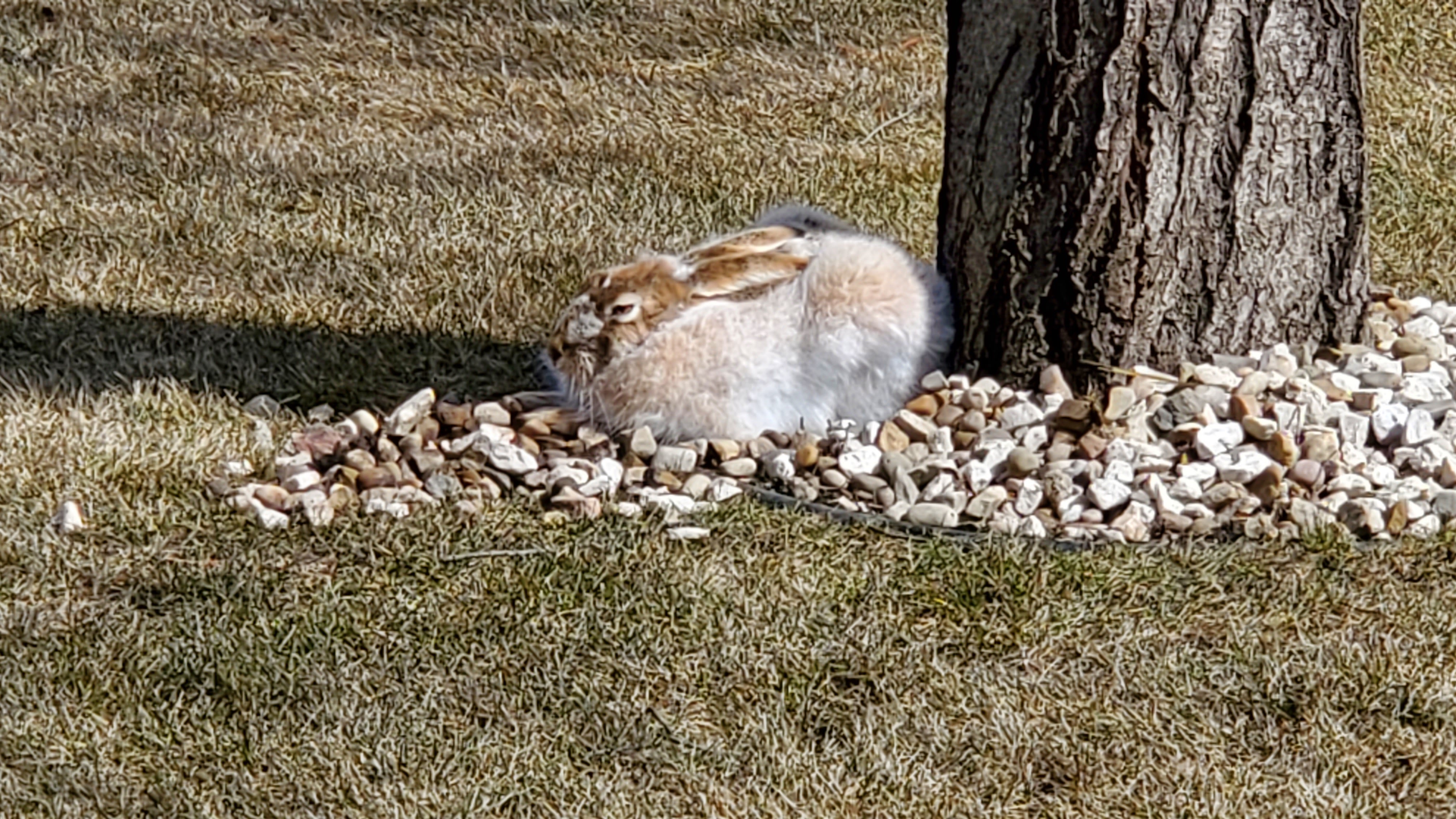 It was a lovely day on Friday and I found myself moving with my coffee in hand on to the deck. The sun was so bright I could hardly see my tablet, but wow the warmth of the sun felt great. Spring has really arrived it would seem. I noticed that the big hares that live in the neighbourhood have begun their change back to their summer colours.