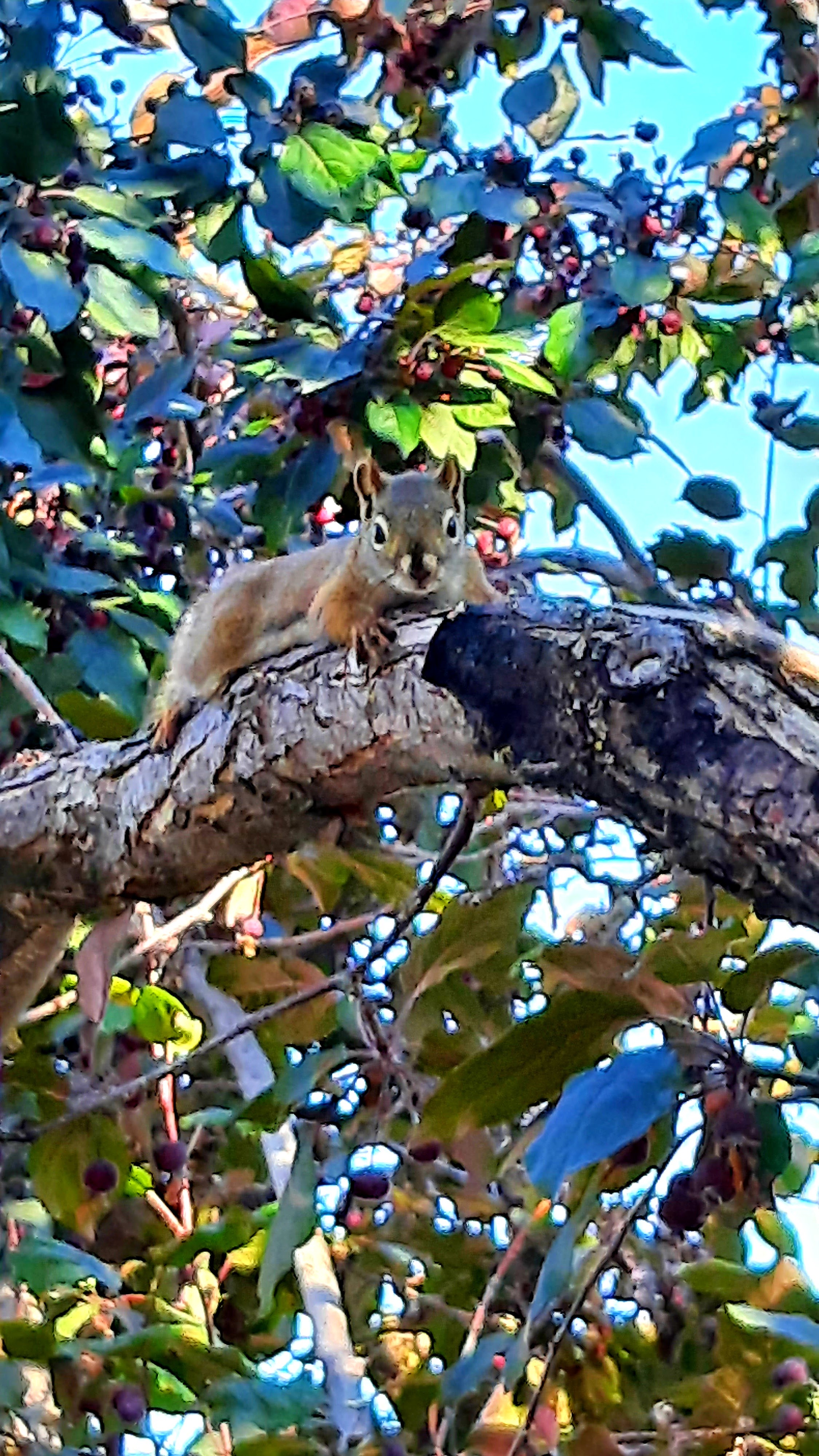 I notice as the apples ripen in our tree the squirrel is more interested in coming by, biting off the apple and then scurrying down to the ground to collect it. Where he hides these I do not know.