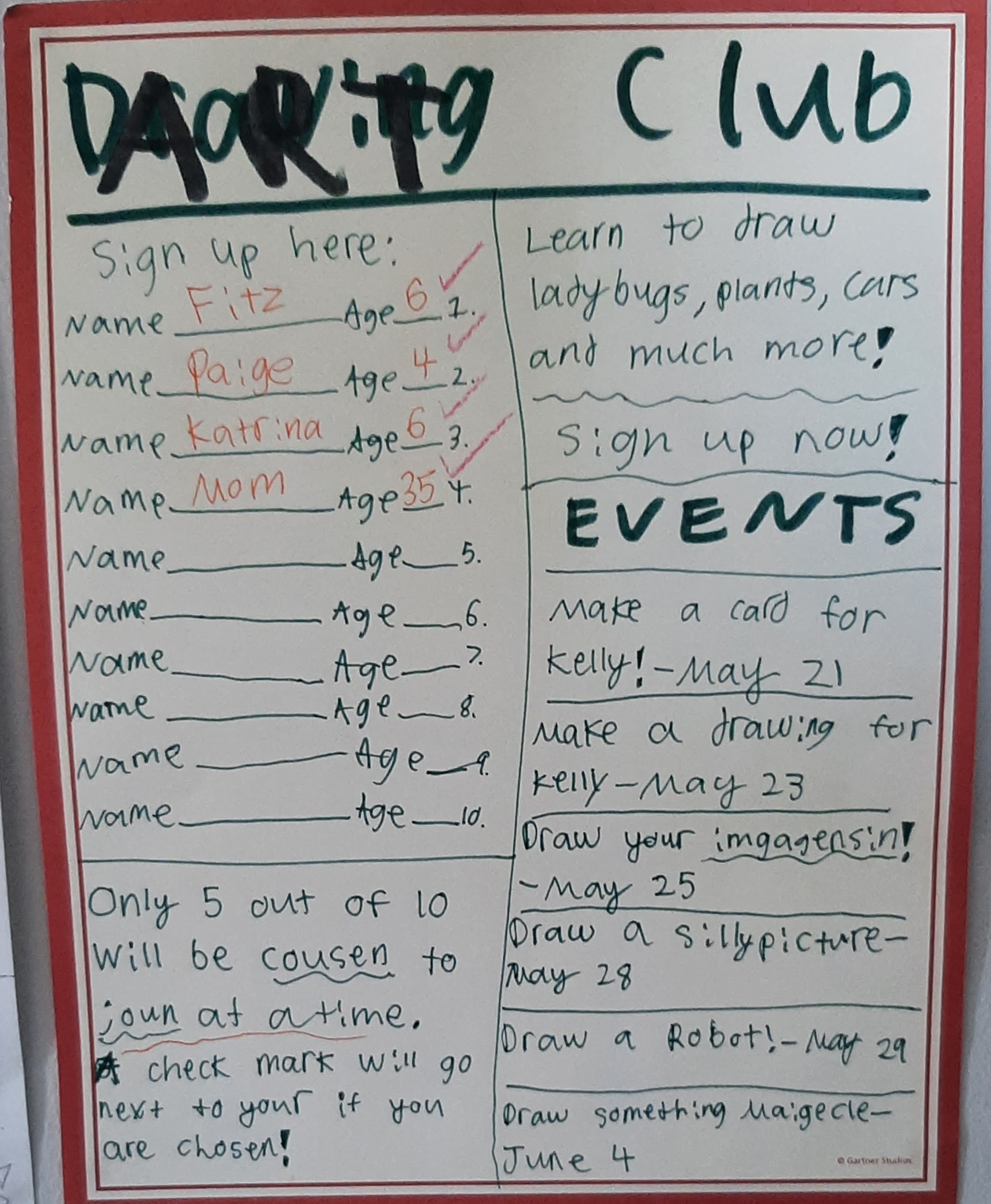 We have the most creative grandchildren. Both sets of grandchildren seem to really enjoy posting notices outside their rooms. This one is outside Carlye’s room – and you’ll see that it has a community outreach focus – helping out Kelly, a neighbour, who had some surgery.