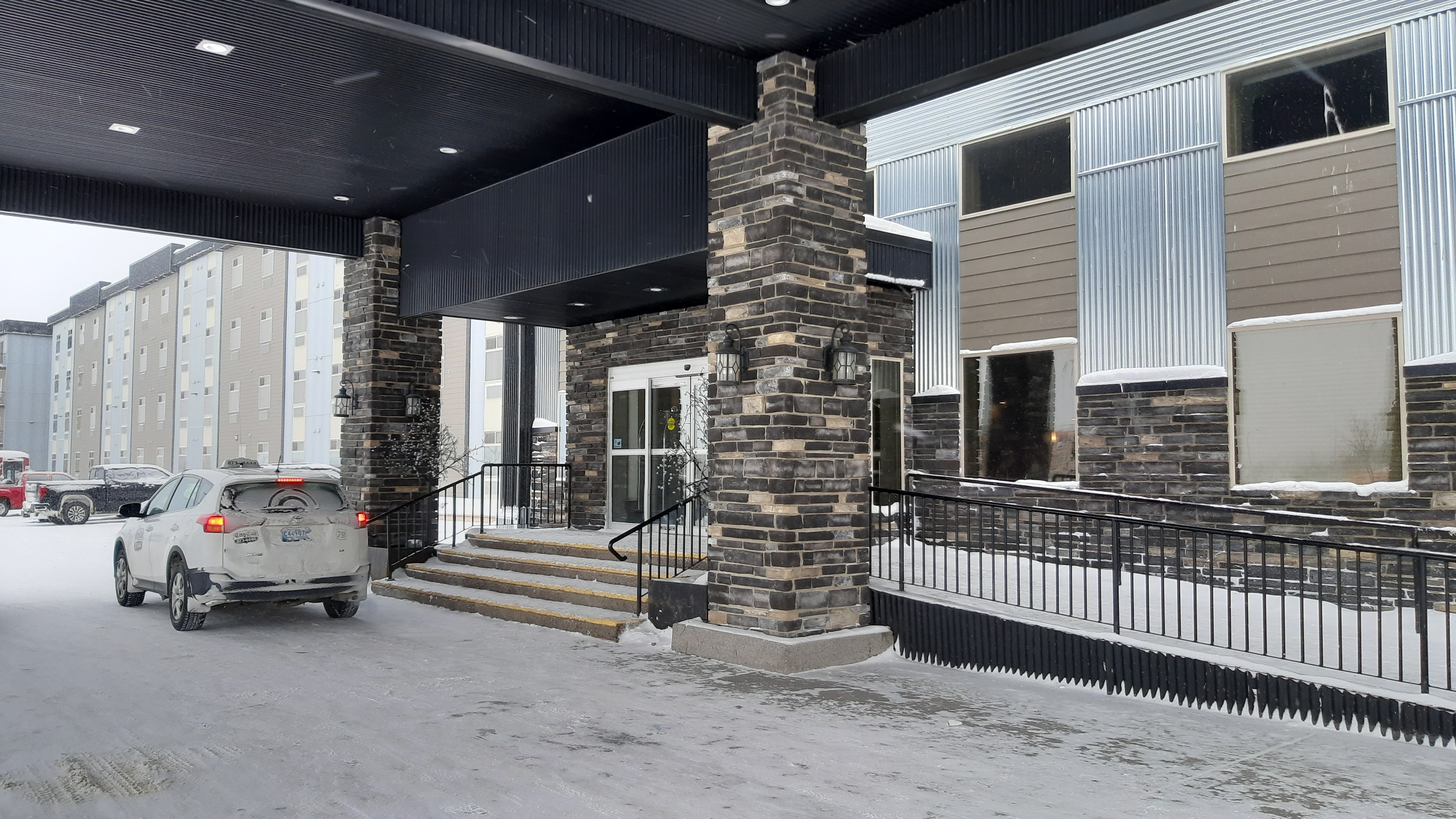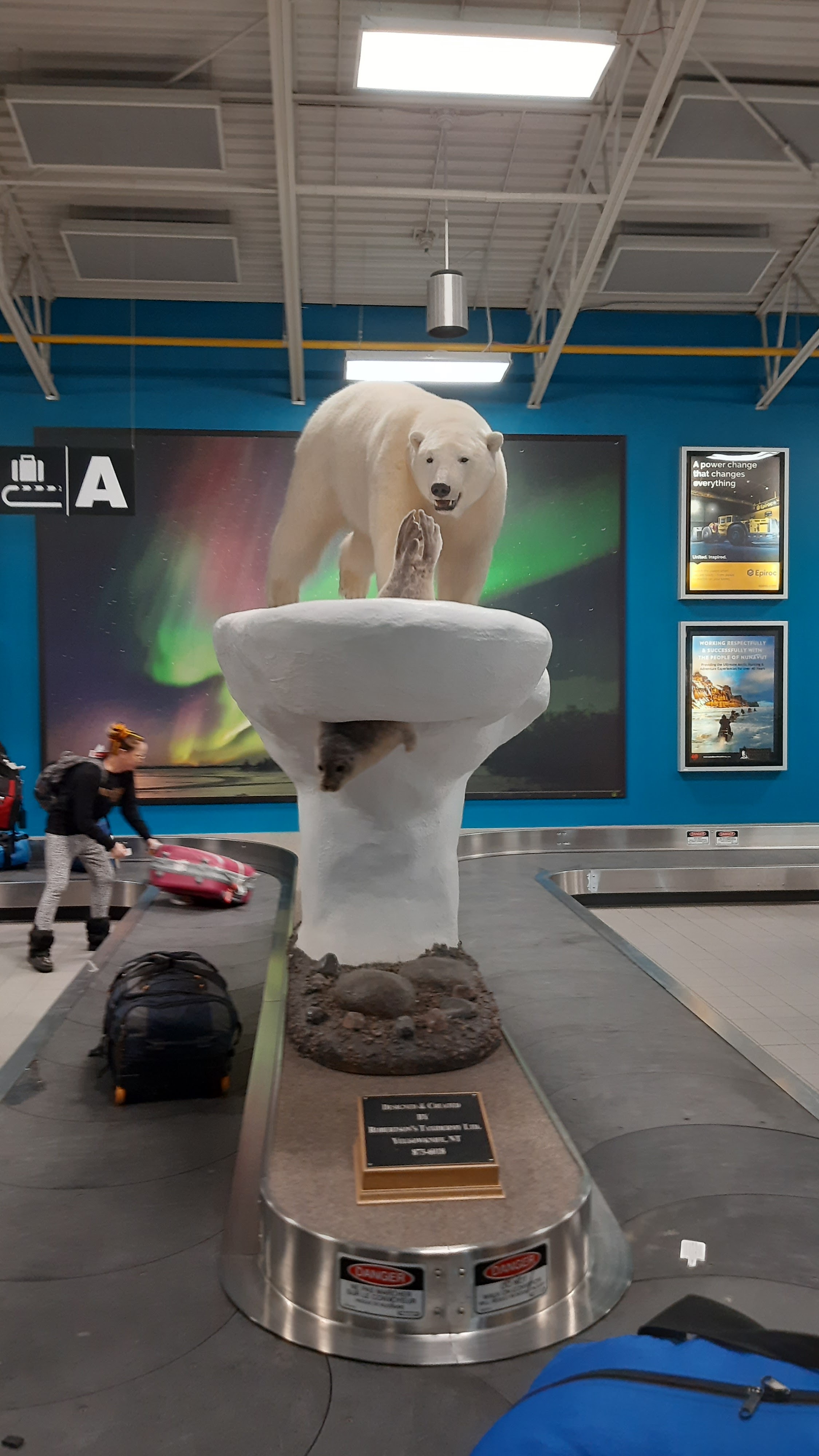 As you can see, it was cold and windy there. Winter is well-established in town. When you land in Yellowknife a polar bear chasing a seal is mounted over the luggage rack, which is not really a good representation of the area. Yellowknife is too far from sea ice.