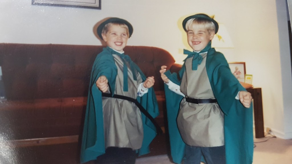 One thing that they did enjoy with each other was Halloween. I remember the year that Wendy made their capes so they could both be Robin Hood. I think the Disney animated movie likely was behind that. But I remember like it was yesterday taking this picture because I asked them to pretend they were stopping the bad guy!