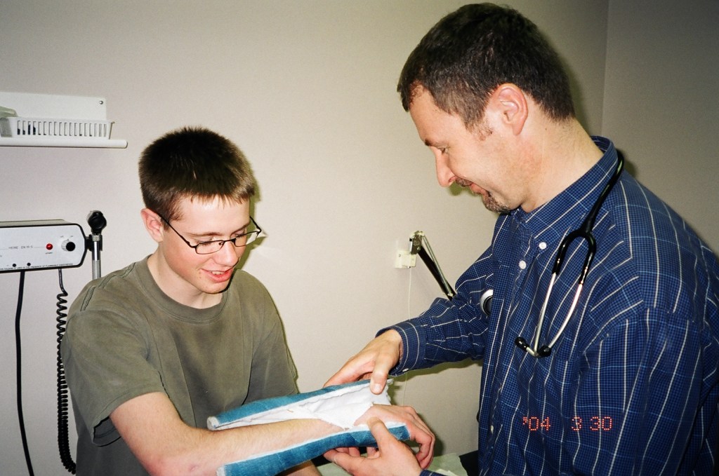 I remember this moment like it was yesterday. Having fallen off a mountain – and no I didn’t push him, when it was time to cut the cast off I thought it would make a great photo to remember that event! I suspect Philip remembers it too!
