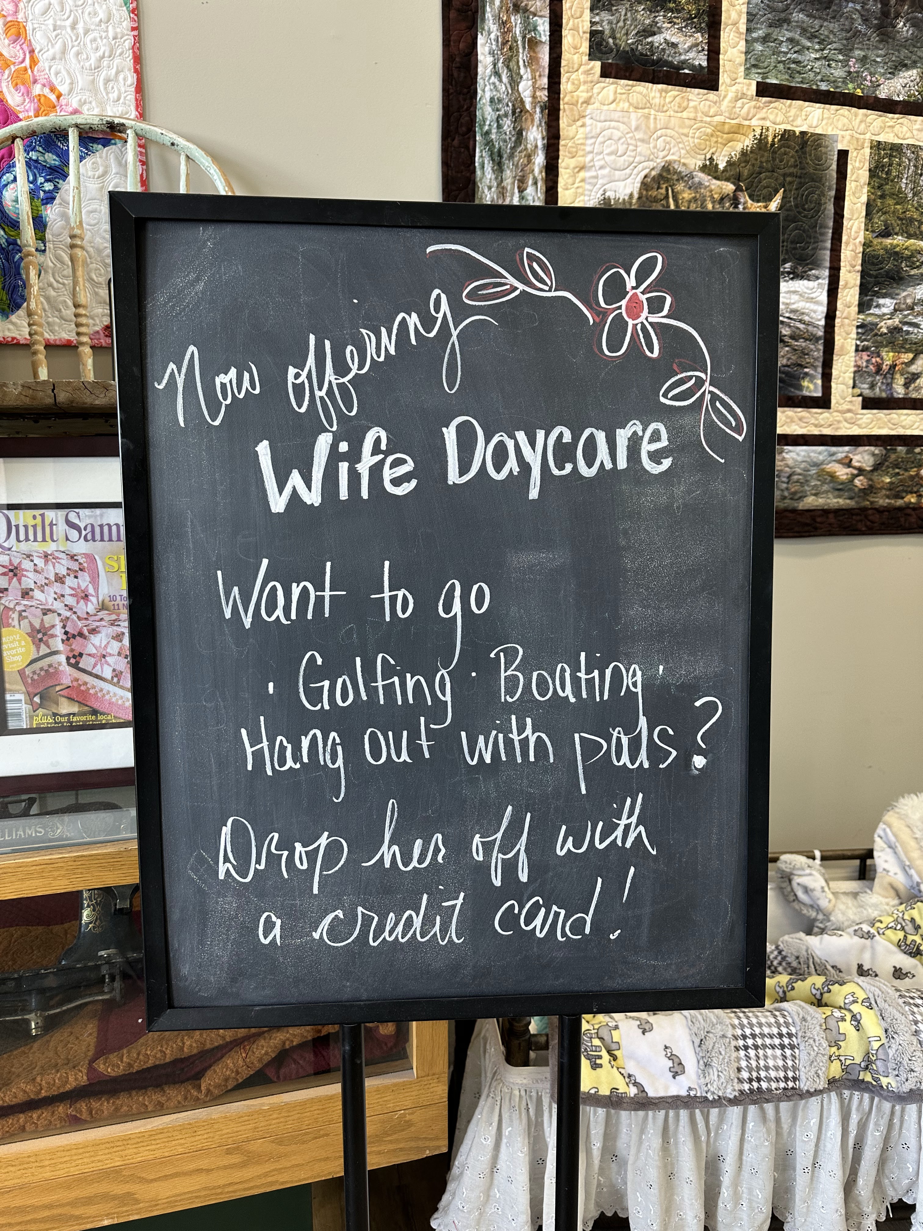 If there has been anything that I see Wendy enjoy is her quilting hobby. We have a quilting shop not far from the house – and while we don’t go there too often, this sign sits near the entrance.