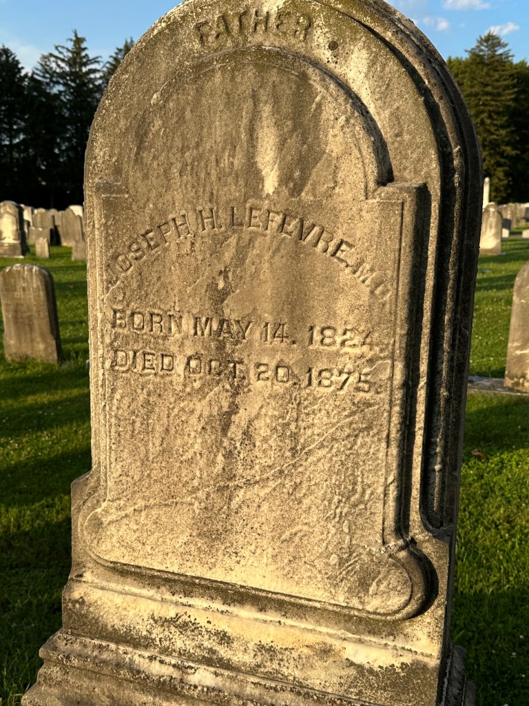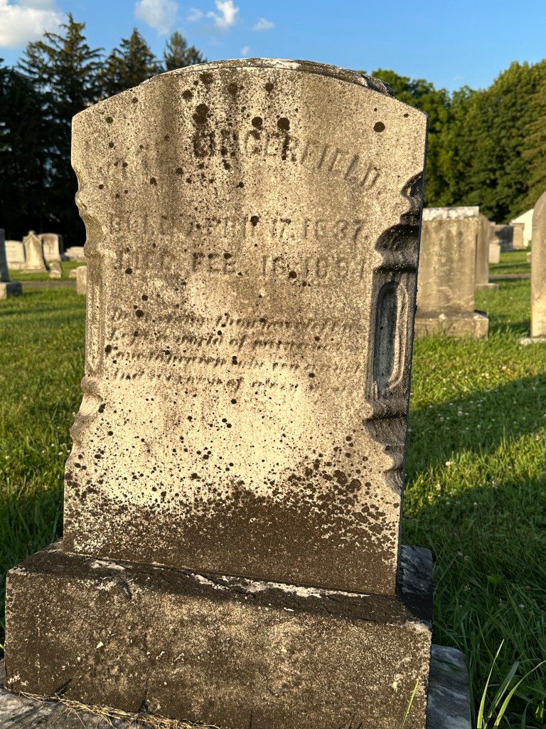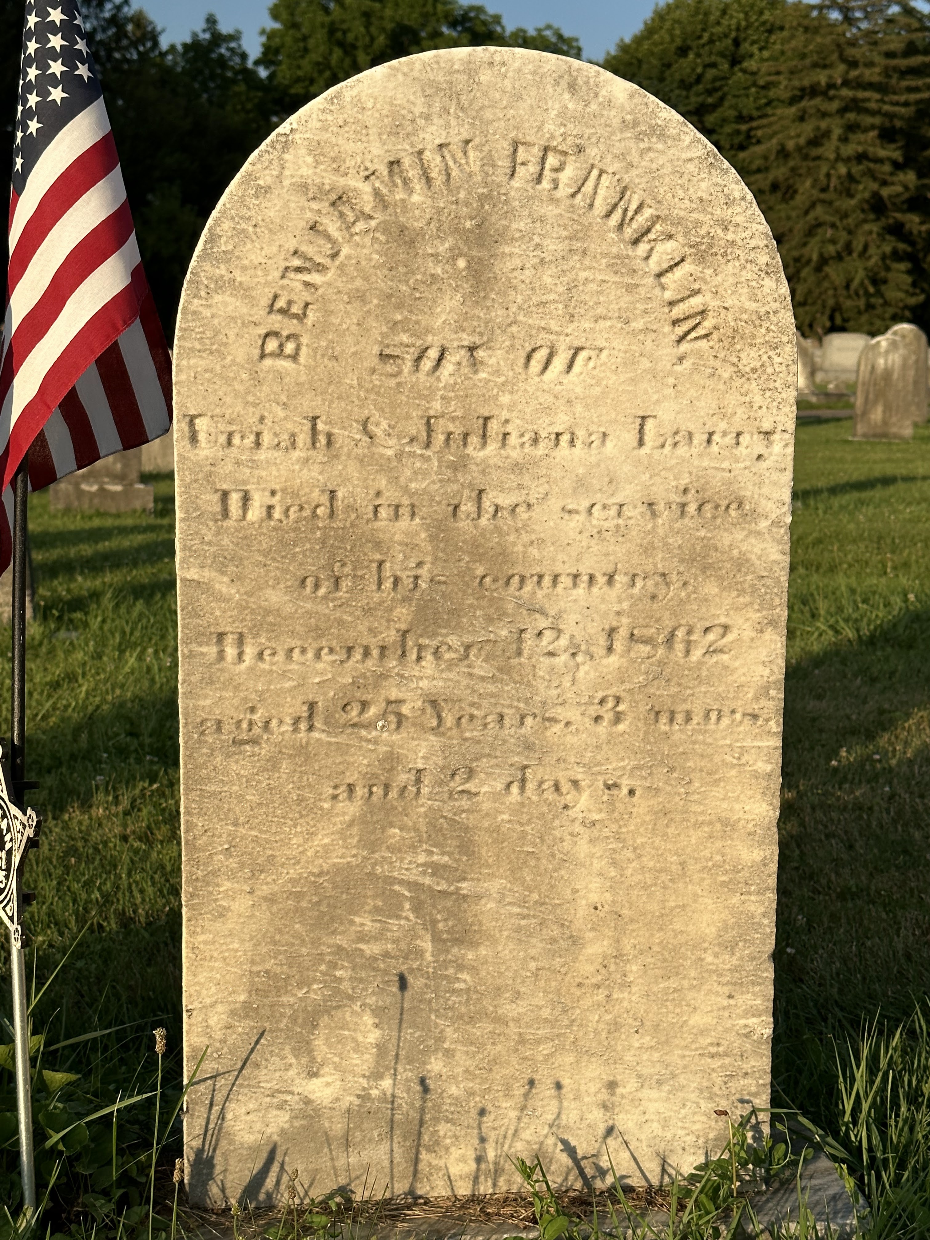 But here’s the stone I was most fascinated by – the marker of a soldier. His name is interesting enough – Benjamin Franklin. I imagine that his parents were thinking of the great man who was active as a writer, scientist, inventor, statesman, diplomat, printer, publisher, and Vice President. This young man who died at 25 was a serviceman. You’ll note he died in December of 1862, in the midst of the civil war. My assumption is that he served the northern states. The battle of Gettysburg , not far from this part of Pennsylvania was in 1863 but was an incursion by the South into northern-held territory which includes this area. How he died we don’t know but the assumption I think is safe that he died in the civil war fighting the south.