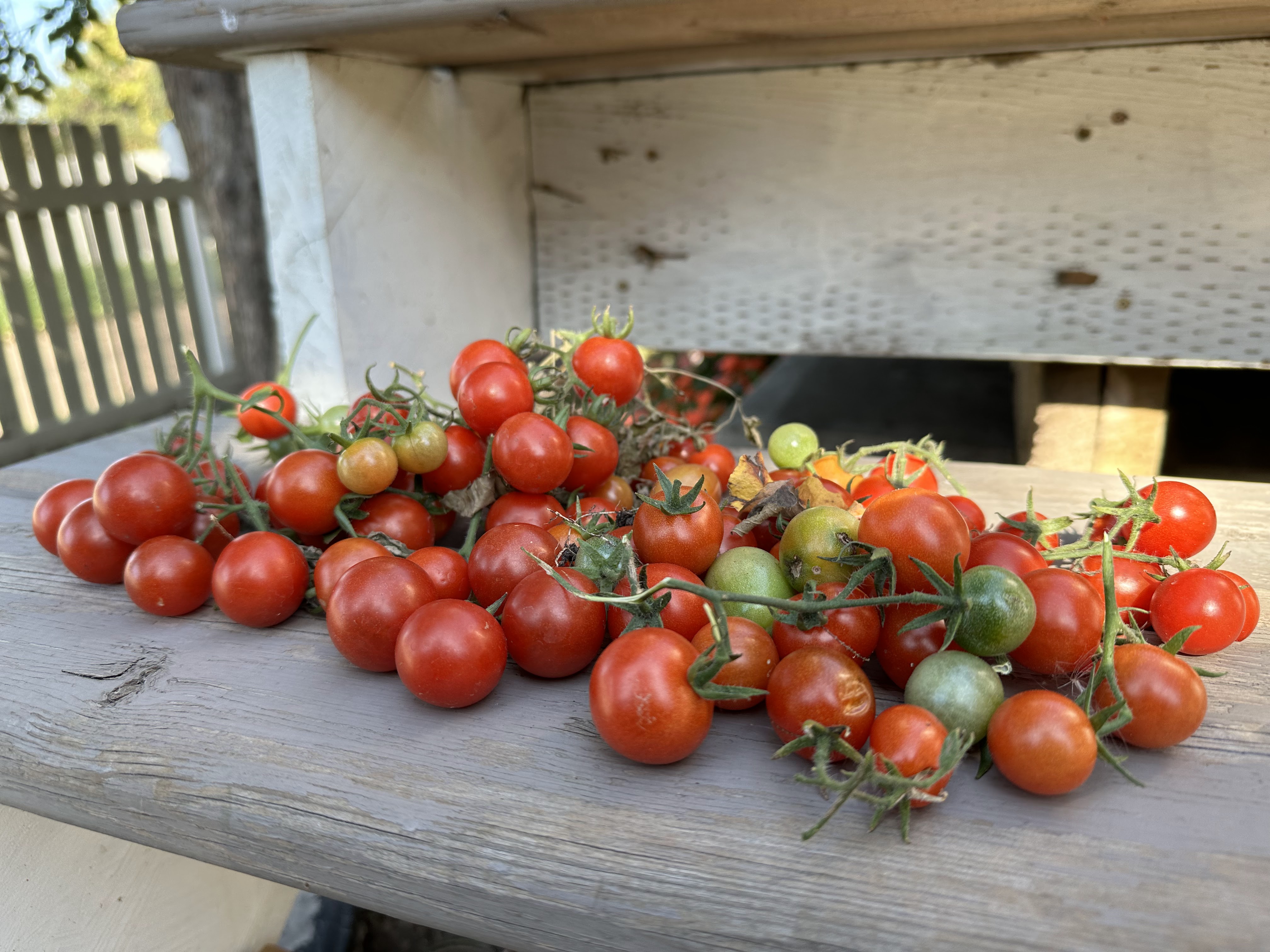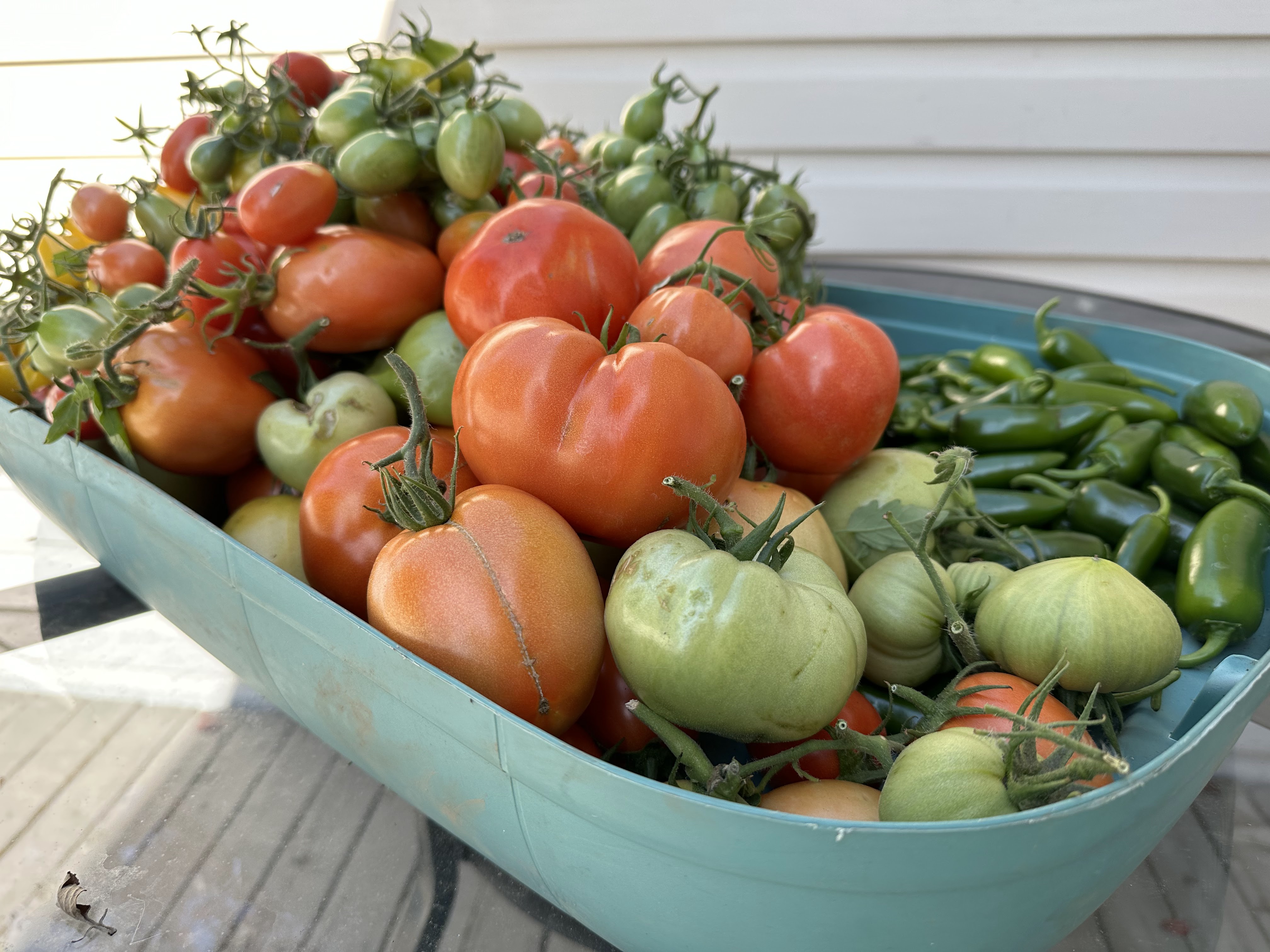 I used this lid from a large storage container to put our tomatoes. I had already picked quite a few tomatoes and we’ve been eating them for about three weeks. But now the number of fruit will include the unripened ones which will go to a cool, dark place in the basement to ripen slowly. Last year we ate tomatoes from the garden into early November.