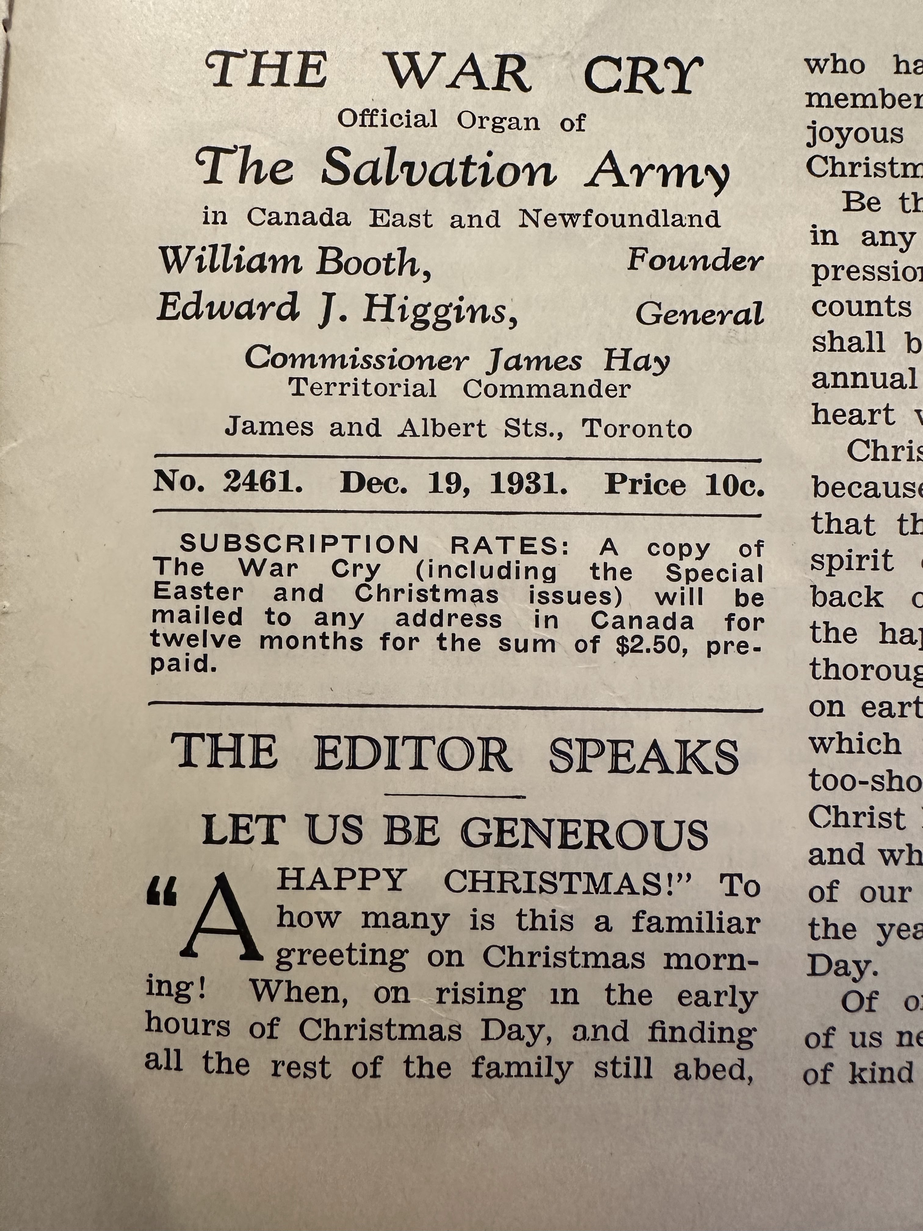 OF course the War Cry was the official organ of The Salvation Army, and you know that if you played Trivial Pursuit in decades past! At 10 cents per copy that is the equivalent of $2 today – so not a bad price. Of course 1931 was well into the Great Depression and I imagine for many 10 cents was a precious amount.