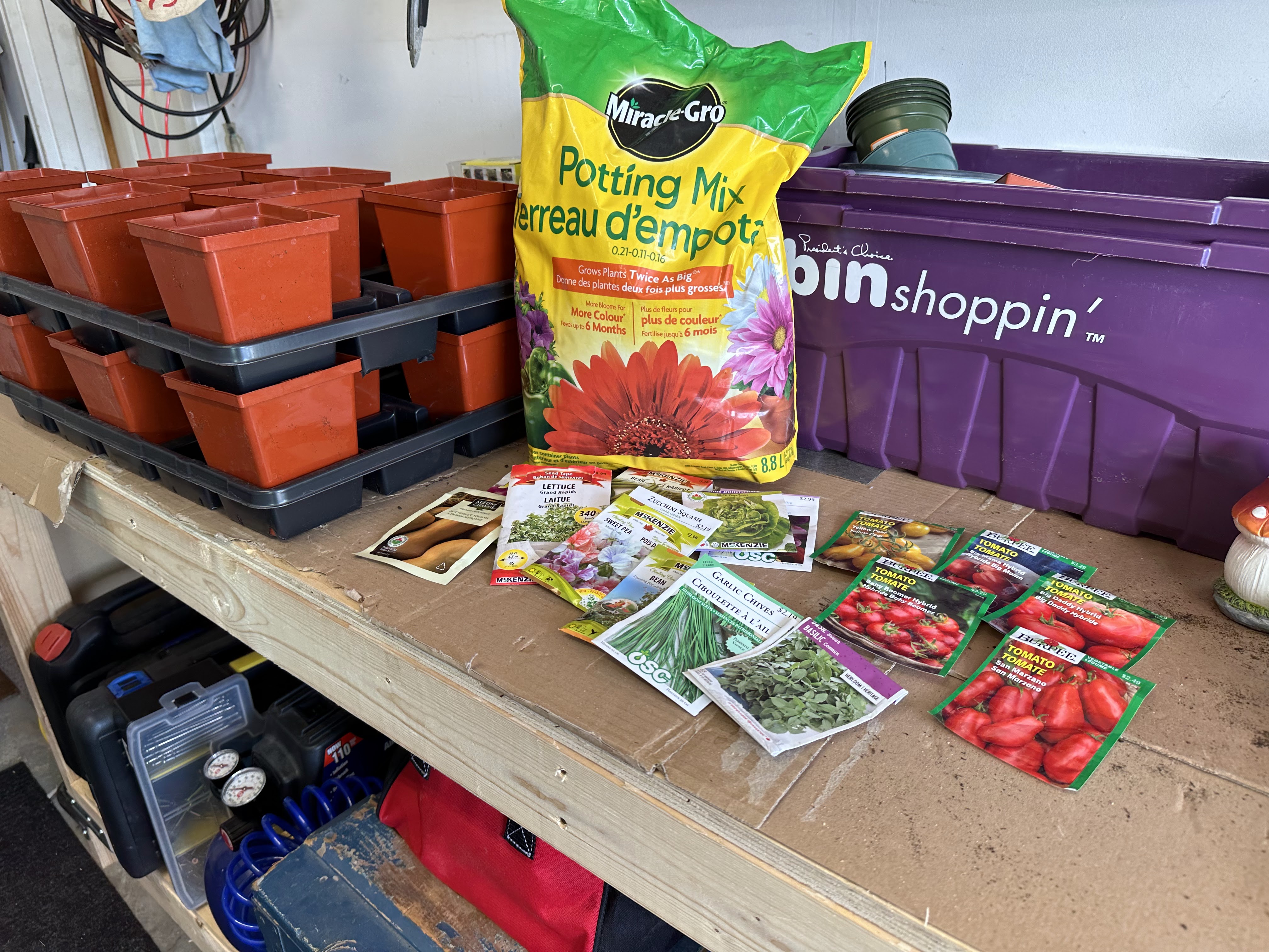 There is a special joy in watching the seeds germinate and pop through the ground. It doesn’t take long for the green leaves to appear and for the plants to reach towards the grow light. Above my Big Mama tomatoes are well under way. I might have too many!