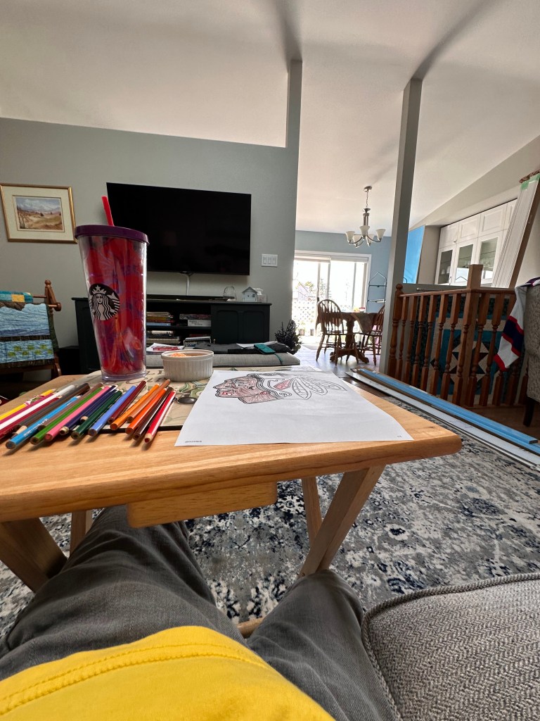 The second thing he loves to do is colour the team logos. He asked if I would look up a few for him on my phone so he could know the colours, then he started taking pictures, of me, of himself, of his colouring, of the room…