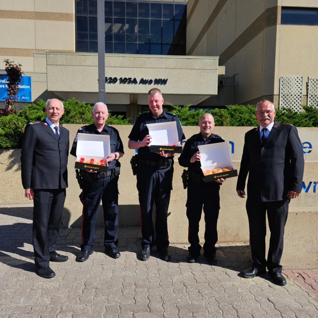Today was my first time to visit Destination Donuts – and wow are their donuts big! Hey Tim, look at the size of their donuts! The owners were delightful and were super happy to support TSA in this way. Ben and I headed to police headquarters and next door to the HQ for the fire department.