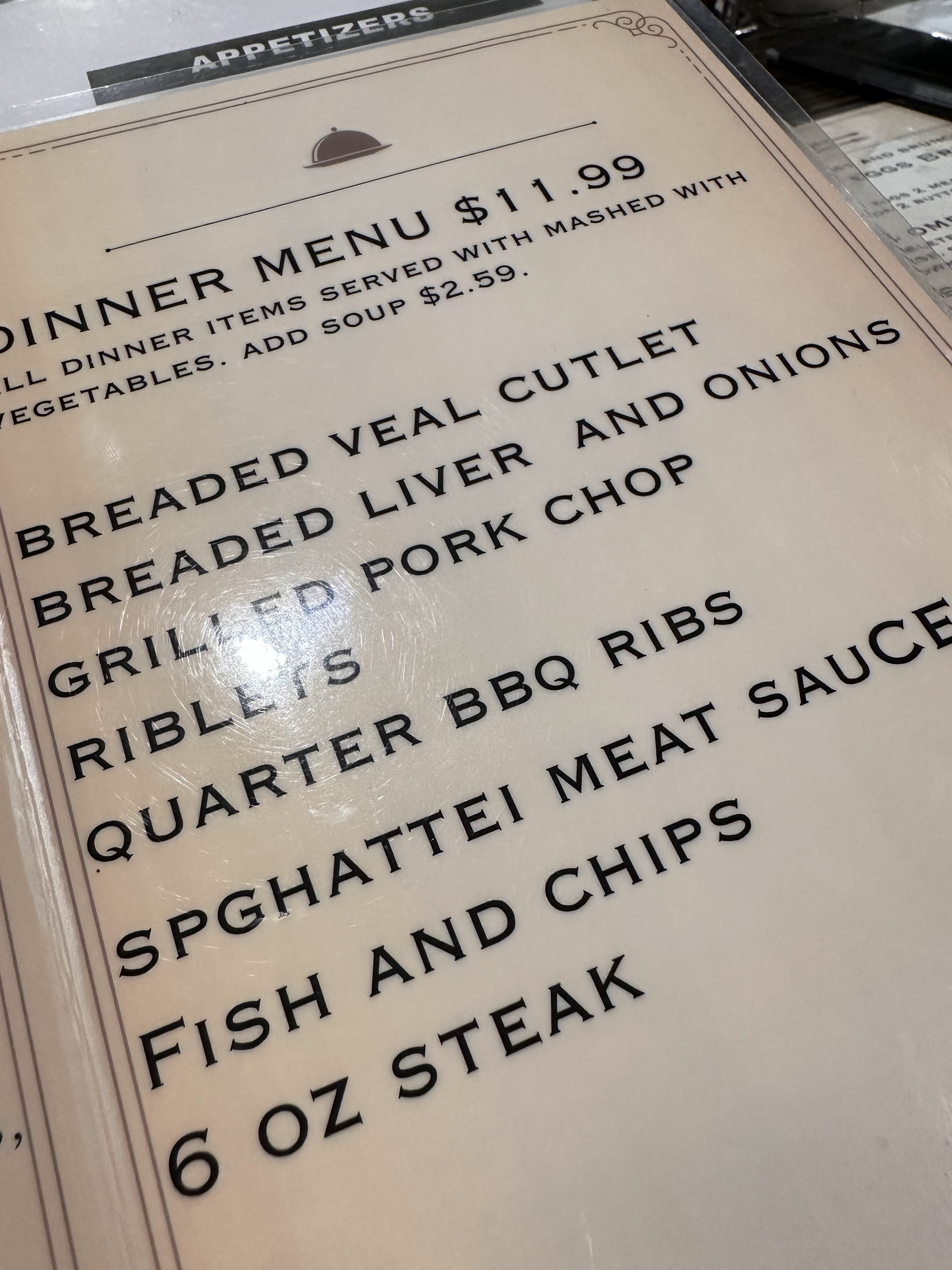 The other evening Wendy and I were out for dinner with Bruce and Karen. We arrived to a sparse restaurant. Now that’s unusual for us as we tend to visit popular places that aren’t part of the restaurant chain scene. We were handed the menu – here’s the senior’s menu.
