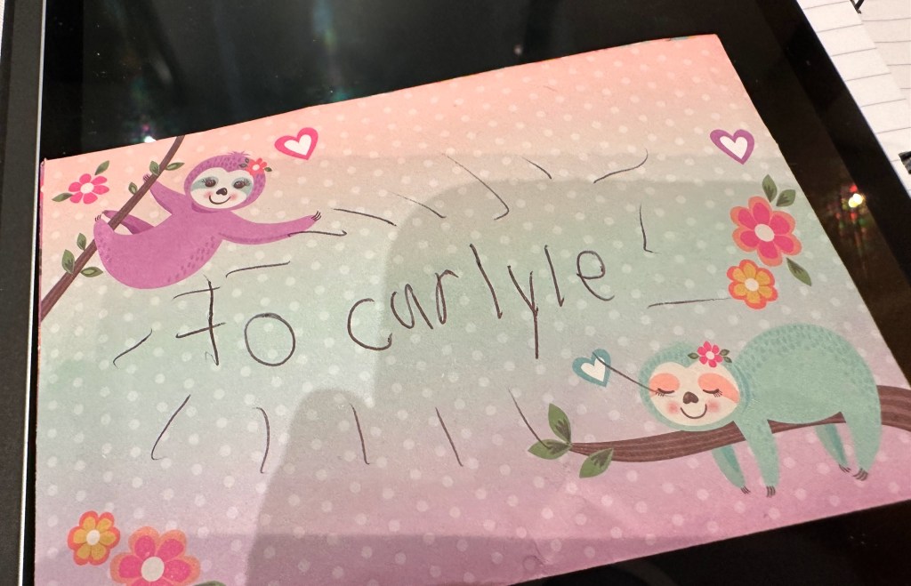 One of the perks of this job is working with Jennifer. She was a young officer in our congregation when we were in Calgary 20 years ago. She has married, has two girls, and is one of the smartest and organized ladies I know and it is a delight to work for her and with her. Her daughter Lucy, is a good friend of our granddaugher Carlyle and when I arrived for our meetings on Thursday I received a “letter” for Carlyle from Lucy. When I gave it to Carlyle she immediately opened it and read it several times. I suspect there’s a reply on it’s way even now.