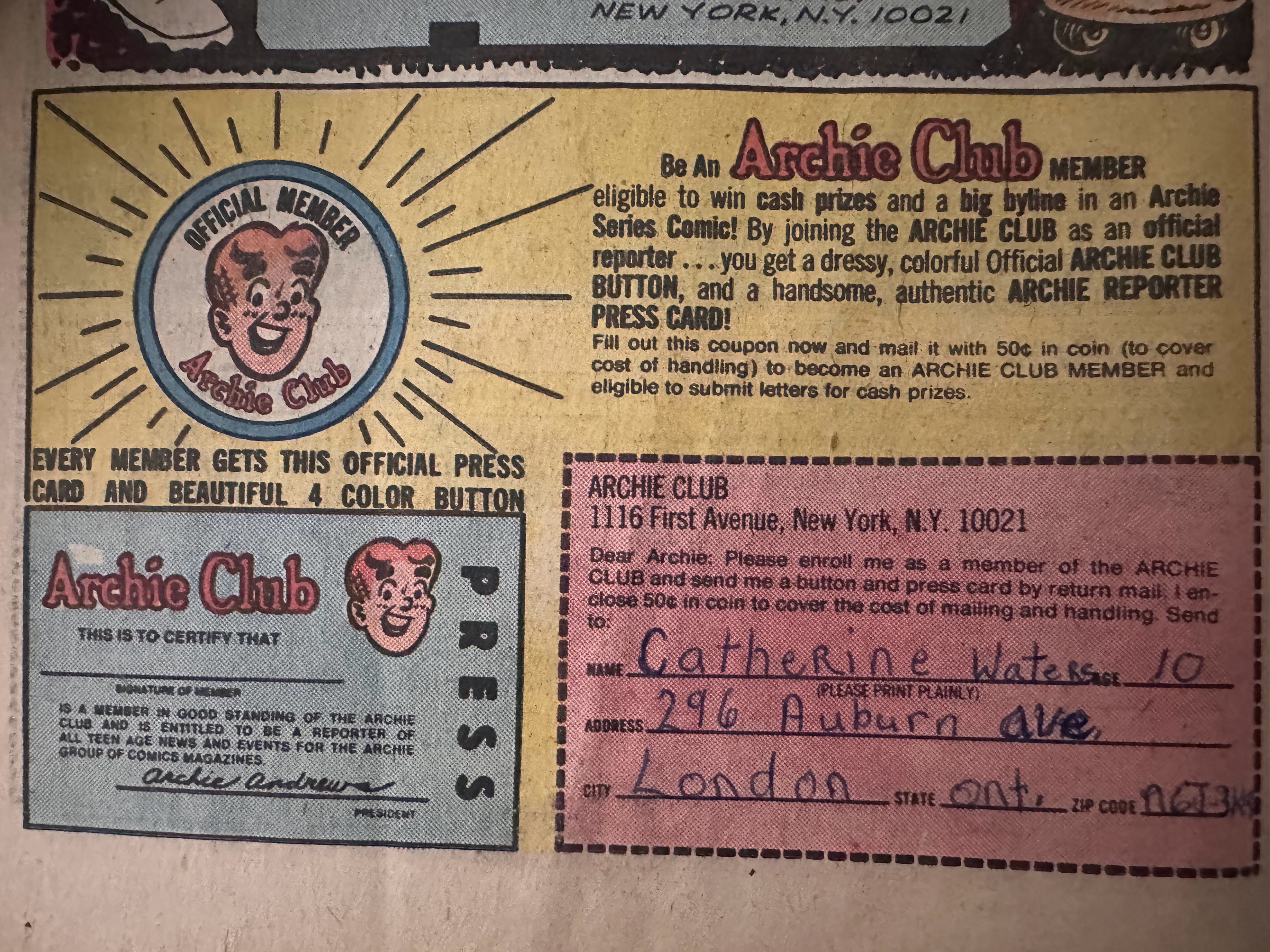 Just add water! Of course I know now that they were selling shrimp eggs and instantly might be a bit of an exaggeration as I’ve grown shrimp to feed fish when I was breeding fish. What else did I find… how about this from 10 year old Catherine Waters of London Ontario who wanted to join the Archie Club. I mean who wouldn’t want to join the club?