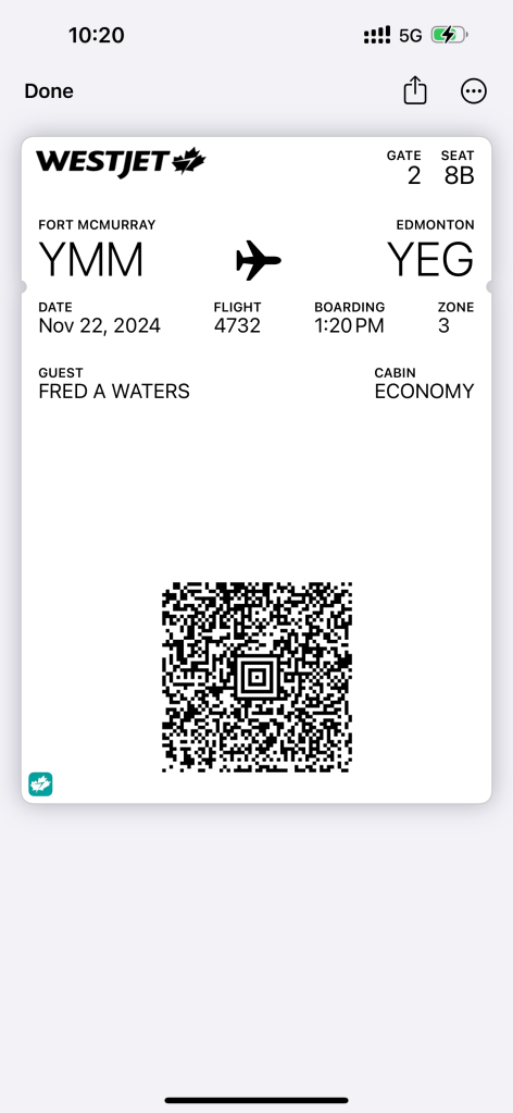 I’ll just be gone one night I had said to Wendy. We fly to Fort Mac in the late afternoon and will be back the next night. Little did I know that West Jet had other plans.