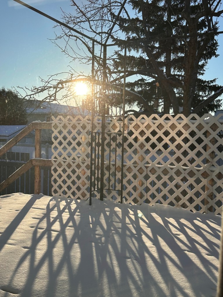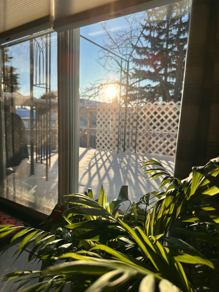 But out here – well sunshine is the common thread. It might be cold in comparison to the east, but as we say, it’s a dry cold. And of course it is sunny! Sunshine, sunshine, sunshine. We have a sky light in our livingroom (which also allows you to see planes flying over) and in the winter the sunshine just seems brighter. We love our skylight.