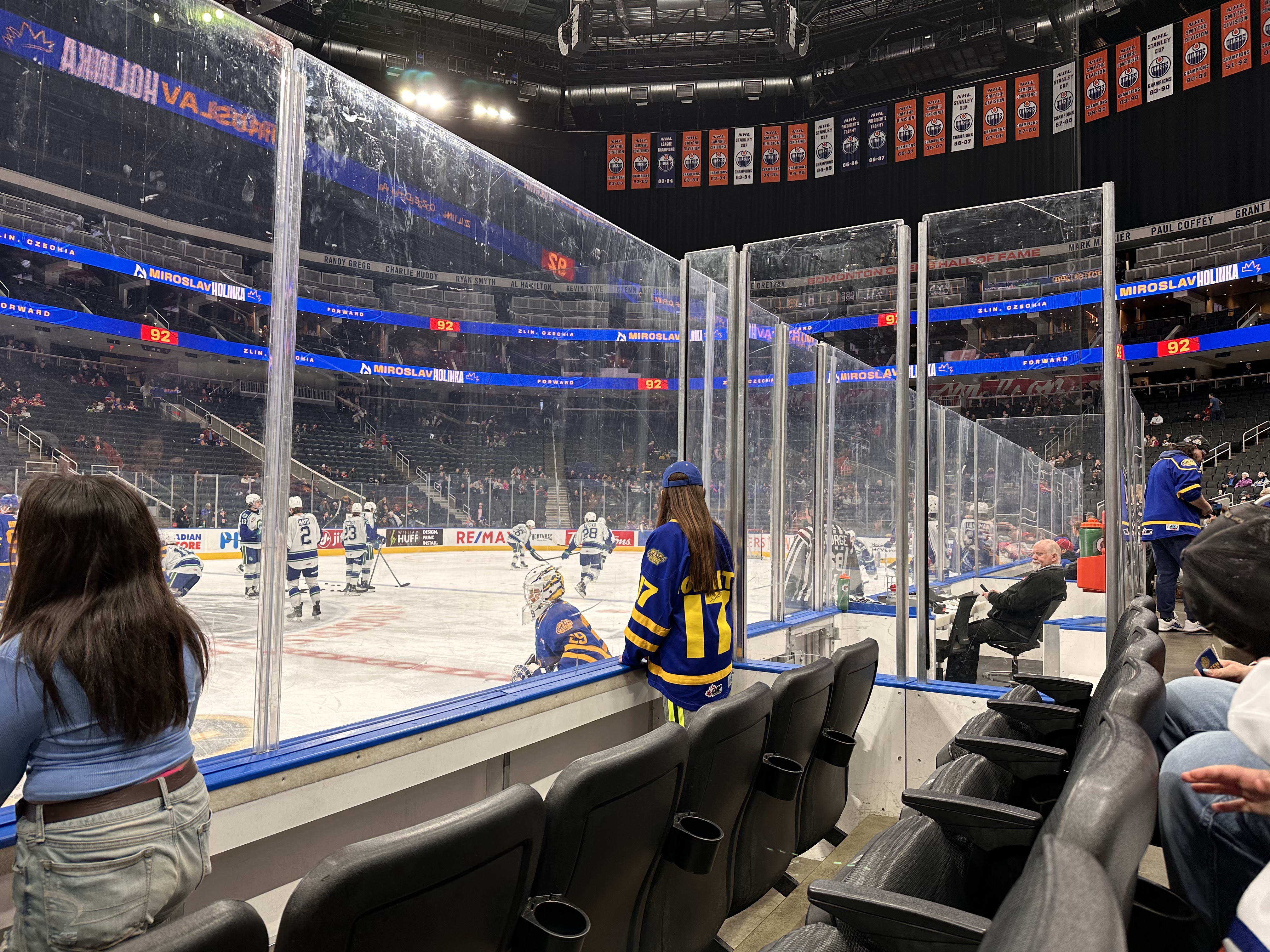 We arrived early and grabbed our seats just three rows off the ice right by the penalty boxes with pop, popcorn and the like in hand. It was warm up time. One of the players through a puck over the glass to one of the kids. I should have also asked for one if they are worth $1500.